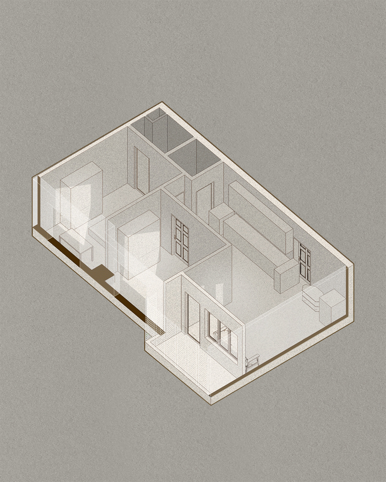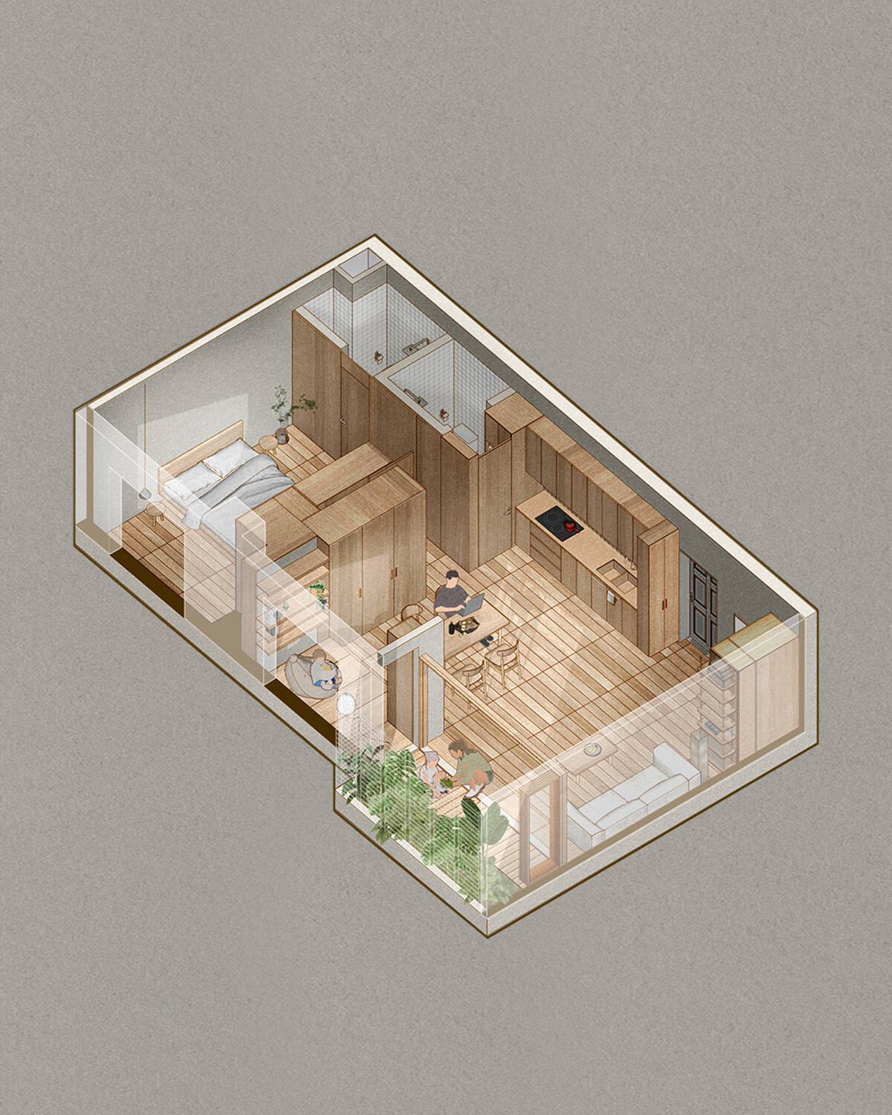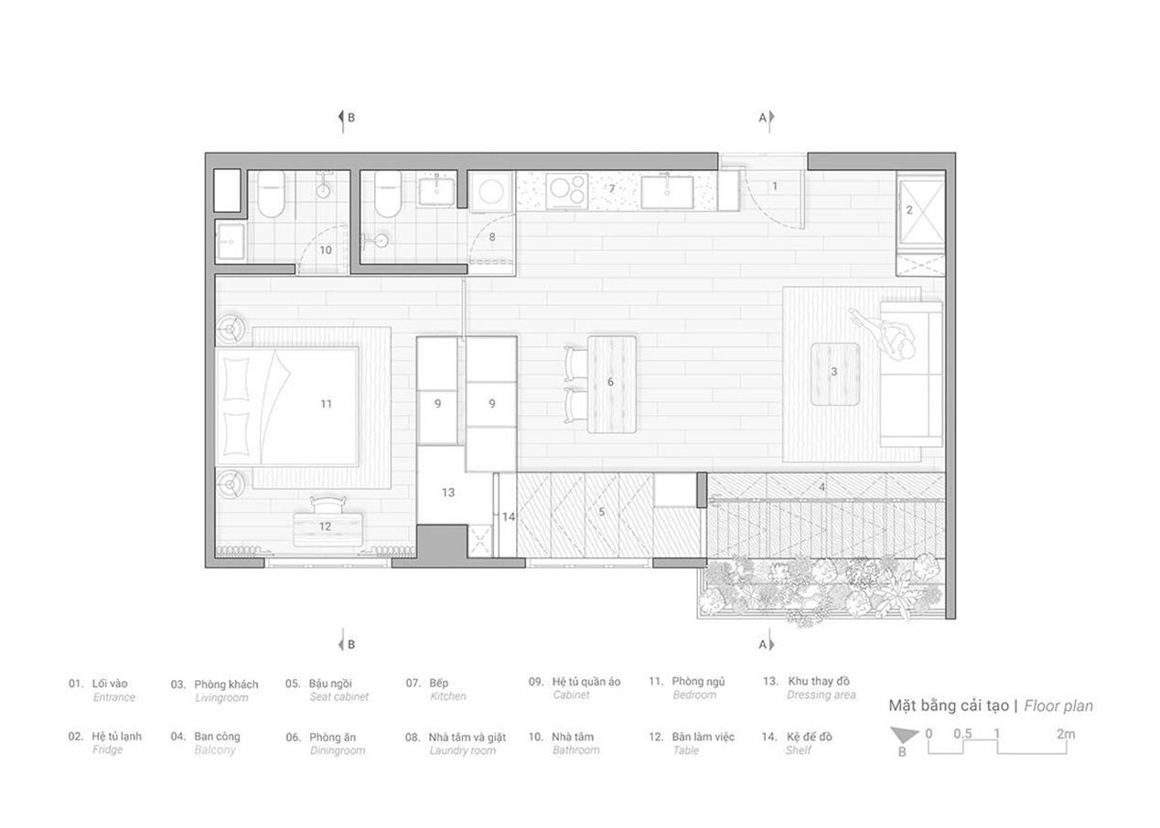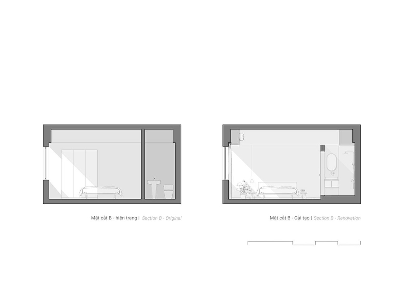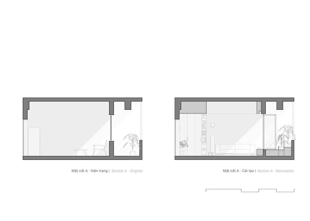 TAH là căn hộ chung cư có diện tích chỉ 62m², hiện trạng đã cũ, với mong muốn ban đầu của gia chủ là cải tạo đơn giản. Tuy nhiên, điểm đặc biệt nằm ở ban công tràn ngập cây xanh – một lợi thế hiếm có giữa lòng đô thị. Nhận thấy tiềm năng này, nhóm KTS đã đề xuất một phương án cải tạo triệt để hơn, biến ban công thành trung tâm trải nghiệm của toàn bộ căn hộ.