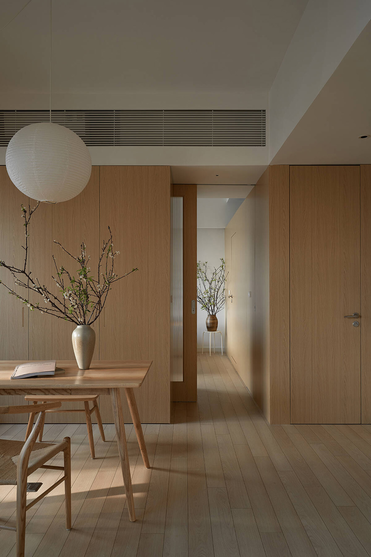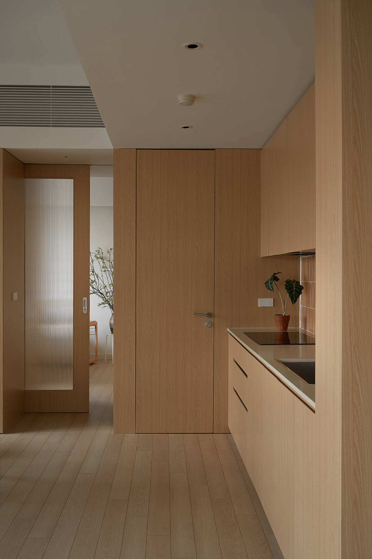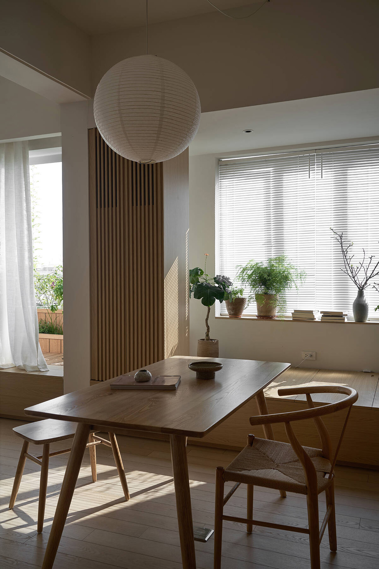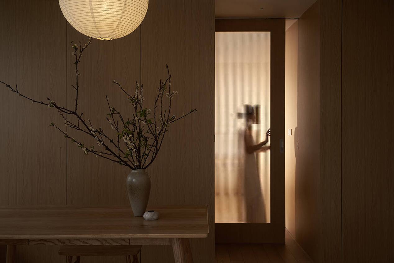 Tại các khu vực liền kề ban công, những ô cửa mở được bố trí khéo léo, giúp ánh sáng tự nhiên lan tỏa sâu vào bên trong. Nhờ đó, cây xanh, nắng gió và nhịp điệu thiên nhiên không chỉ dừng lại ở ban công, mà trở thành một phần của đời sống sinh hoạt hằng ngày.