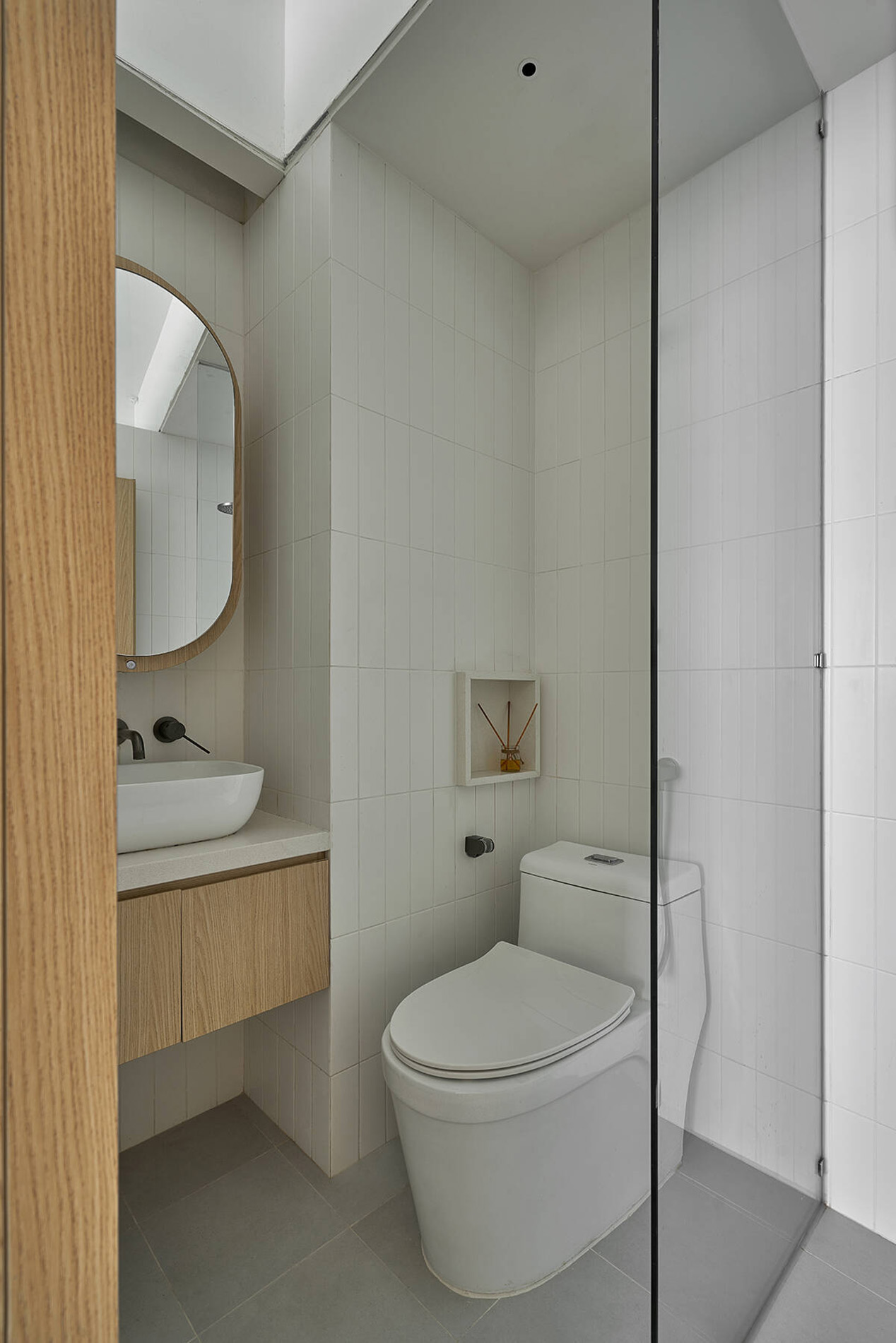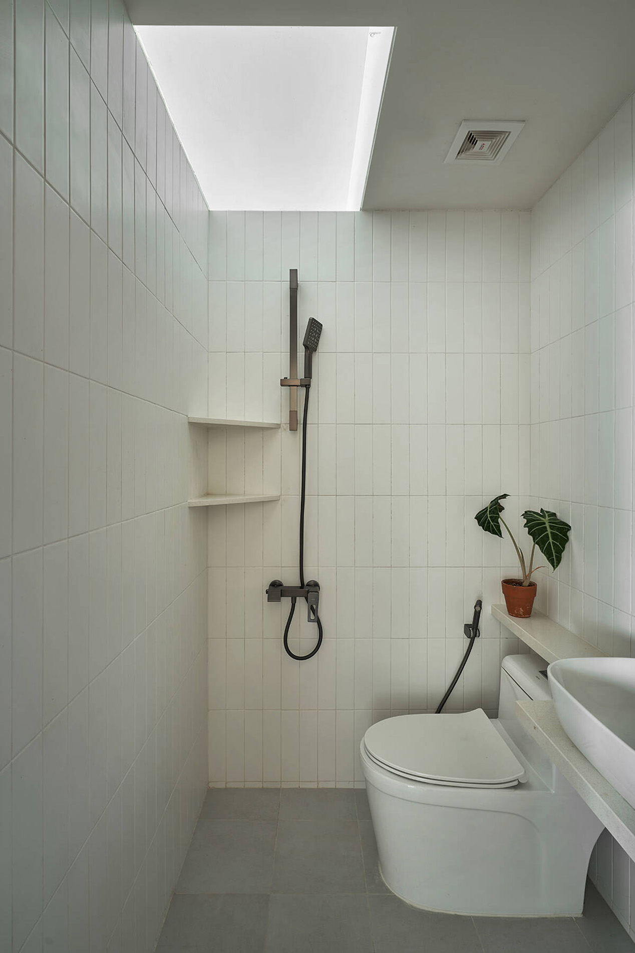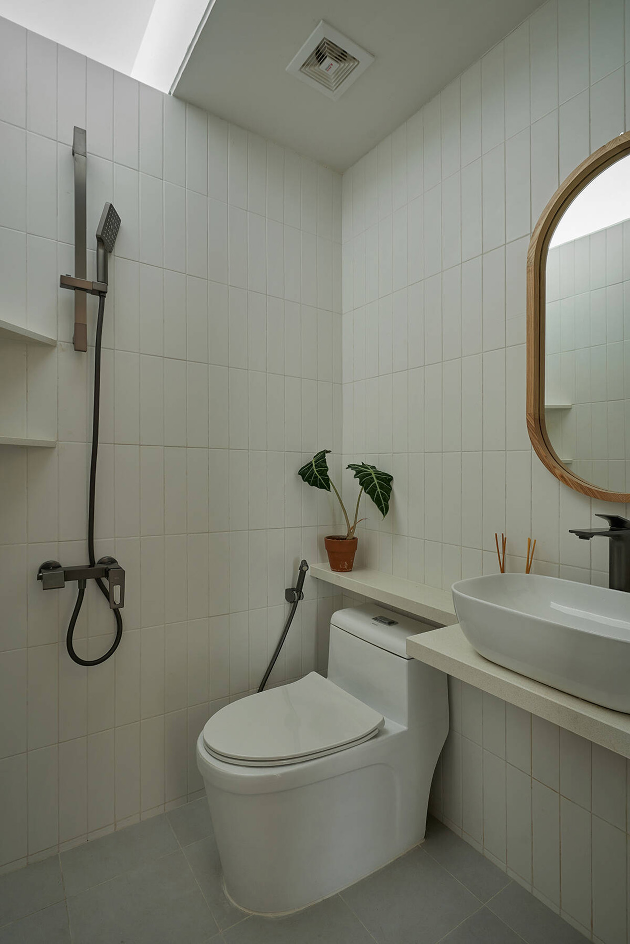 Khu WC – vốn nằm ở vị trí bất lợi – được xử lý bằng tường tỉa thấp để lấy sáng, giảm cảm giác bí bách. Trần thạch cao và hệ đèn downlight cũng được tiết chế tối đa, chỉ bố trí đúng nơi – đúng chức năng, đúng cường độ cần thiết.