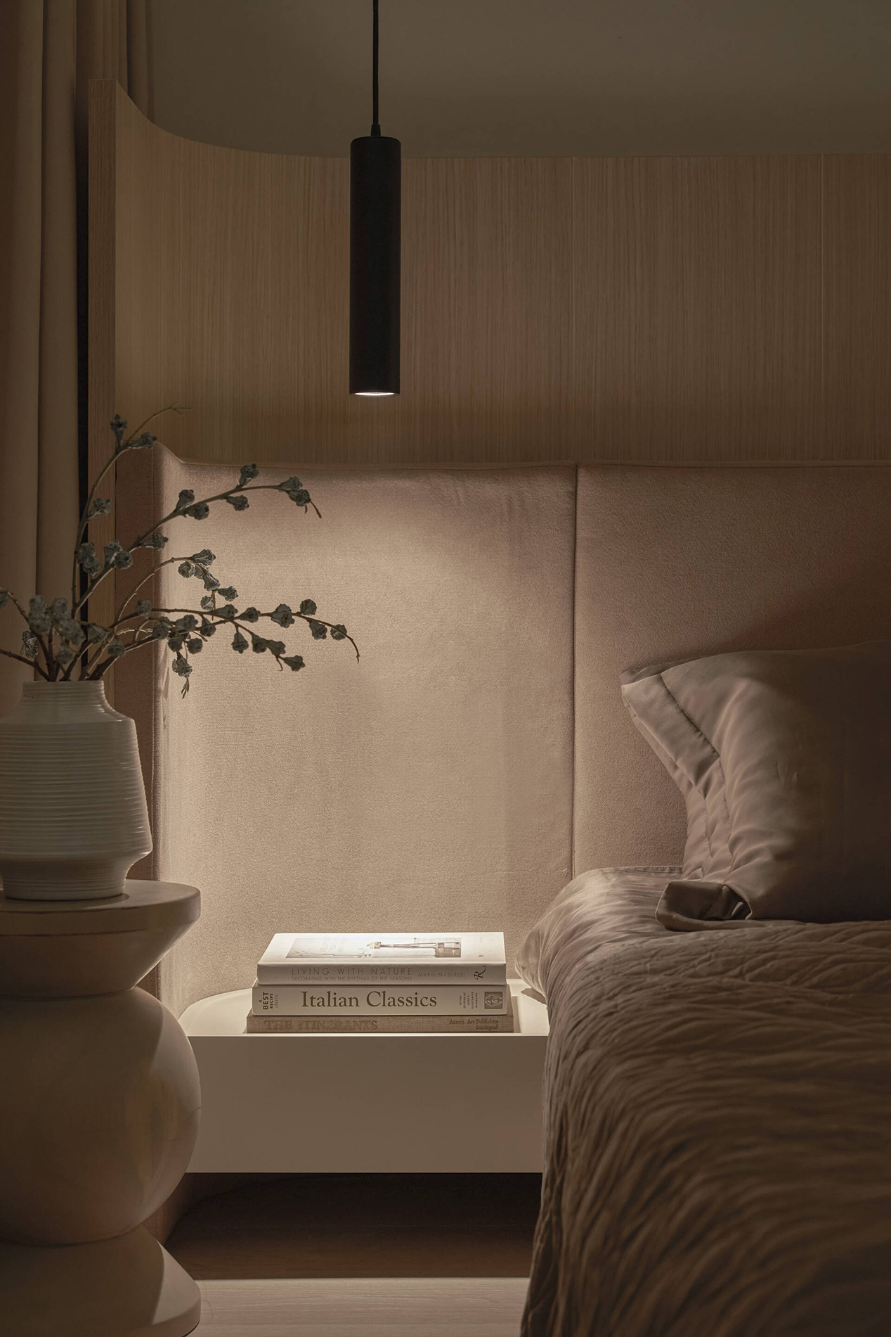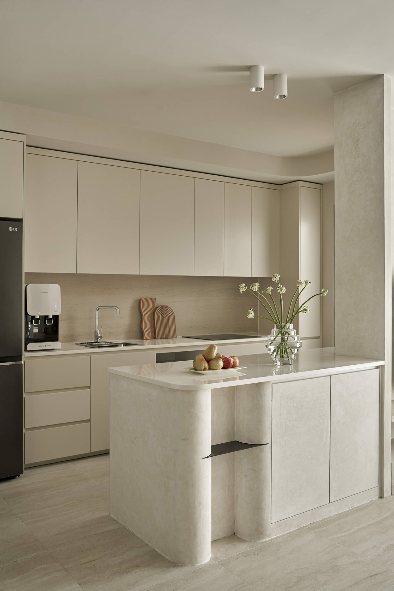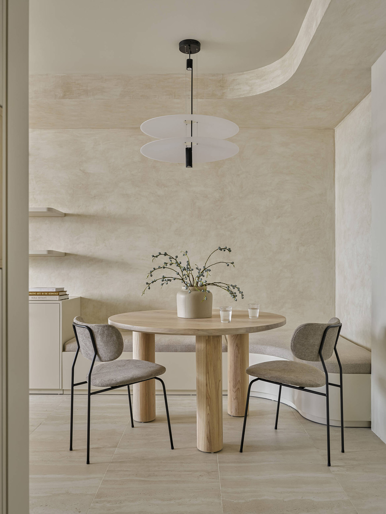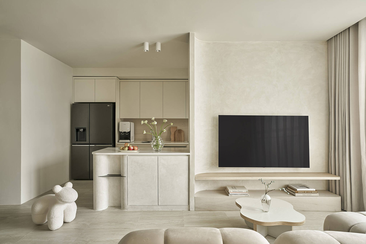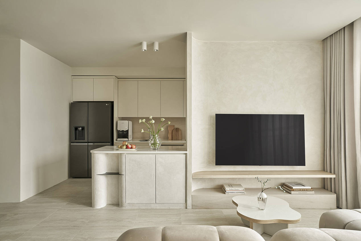Các chi tiết hình khối bo tròn mềm mại được sắp đặt có chủ ý, giúp tổng thể căn hộ trở nên duyên dáng, khiêm nhường nhưng vẫn sang trọng. Thiết kế không hướng đến sự phô trương mà tập trung vào trải nghiệm sống chậm, sống sâu.