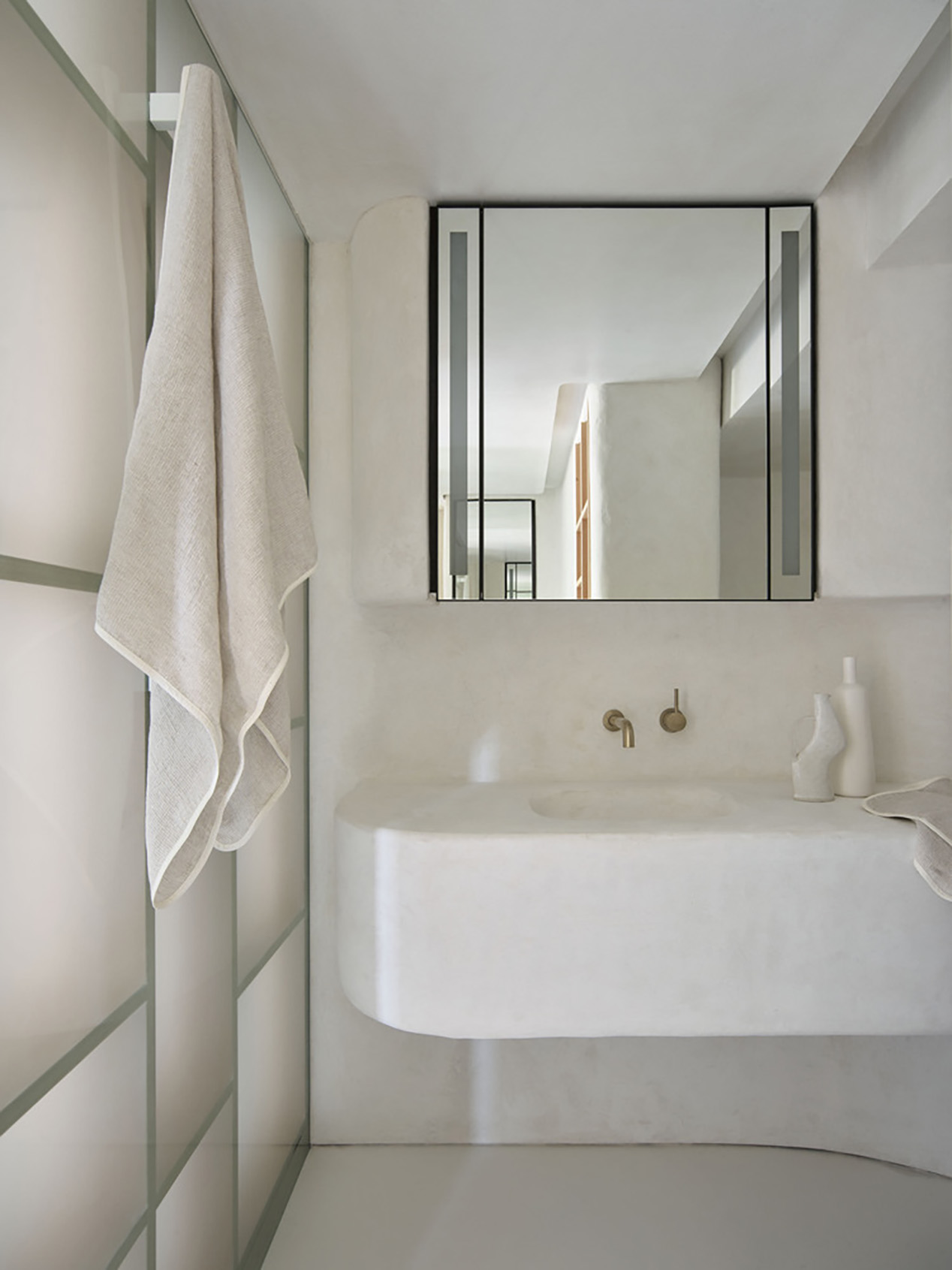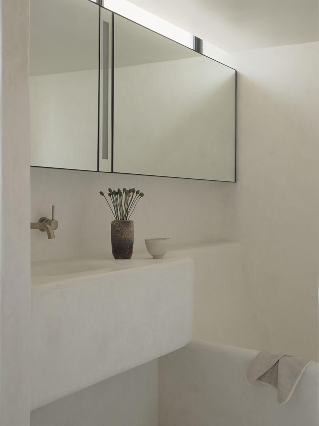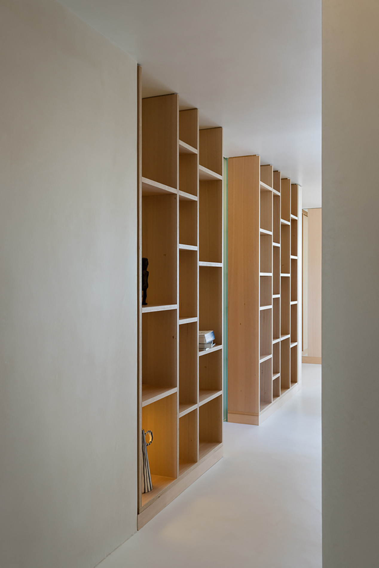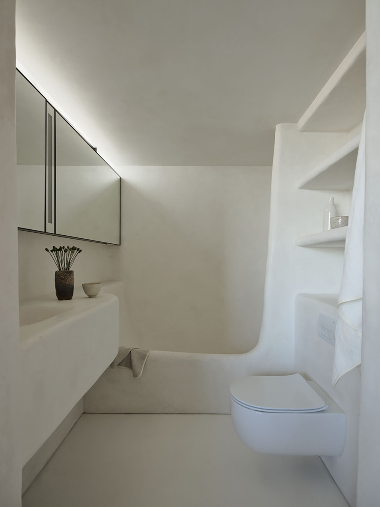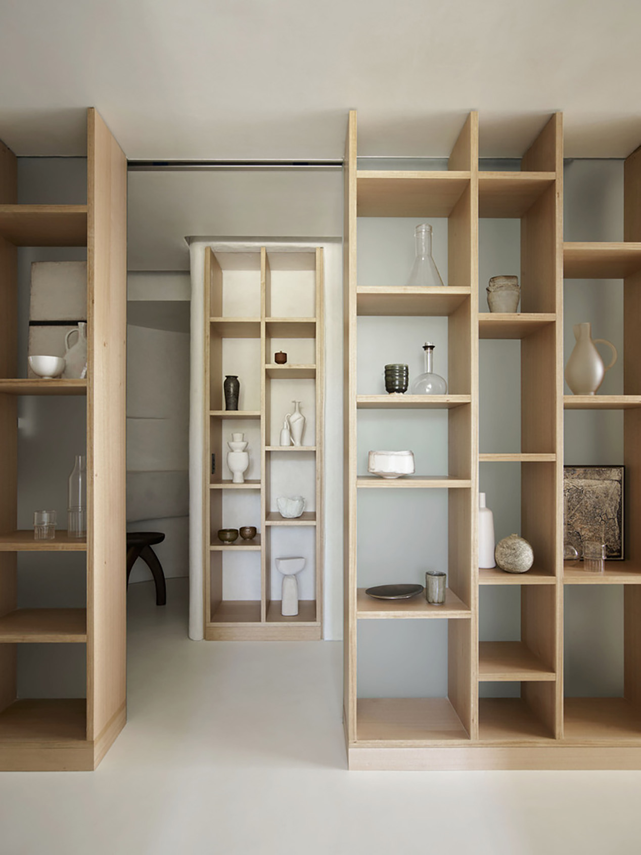Bảng vật liệu của căn hộ được tiết chế tối đa để làm nền cho bộ sưu tập nghệ thuật và đồ gốm của gia chủ. Toàn bộ tường, sàn và trần được phủ lớp vi xi măng thủ công, tạo nên bề mặt liền mạch, mềm mại và giàu tính chạm.