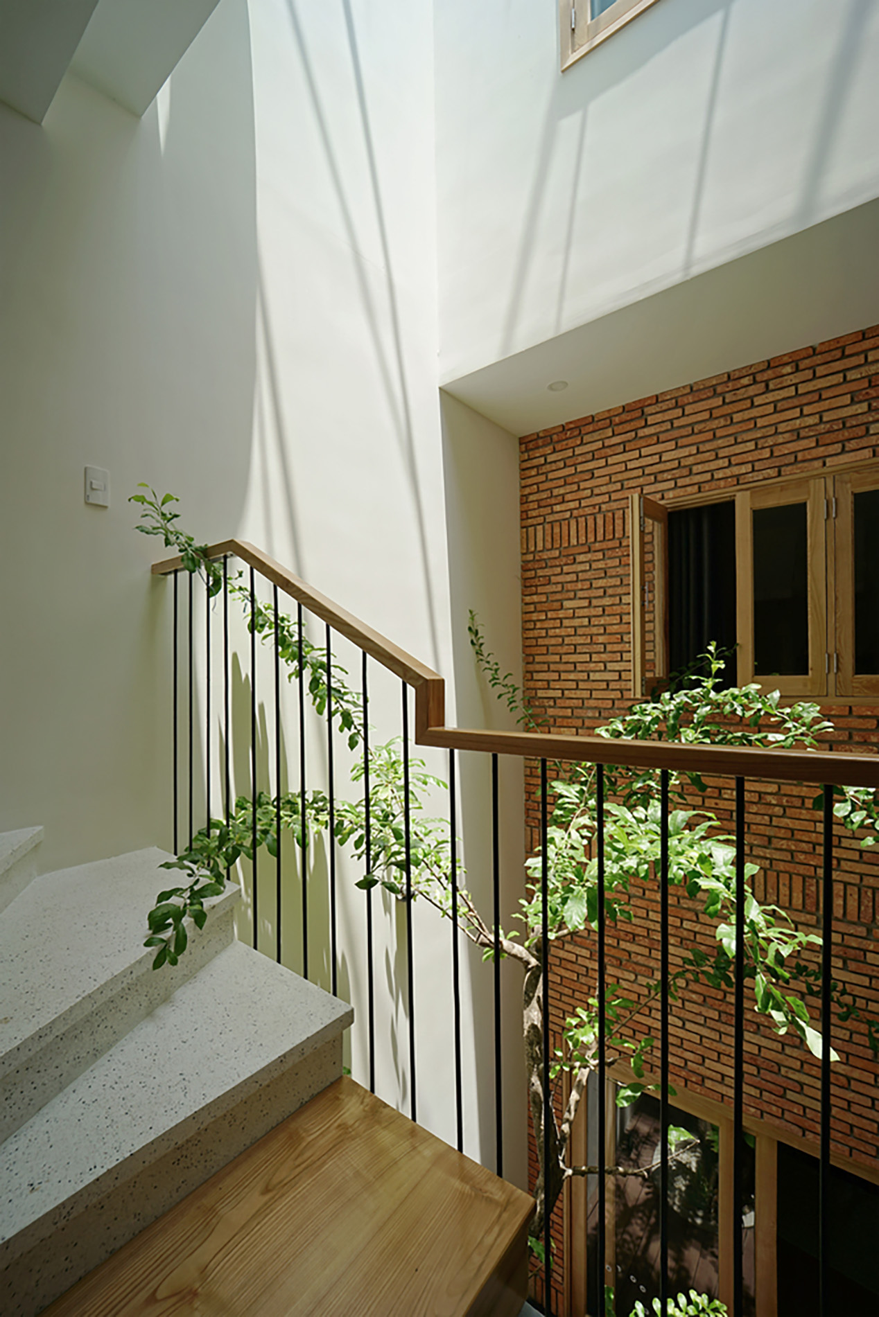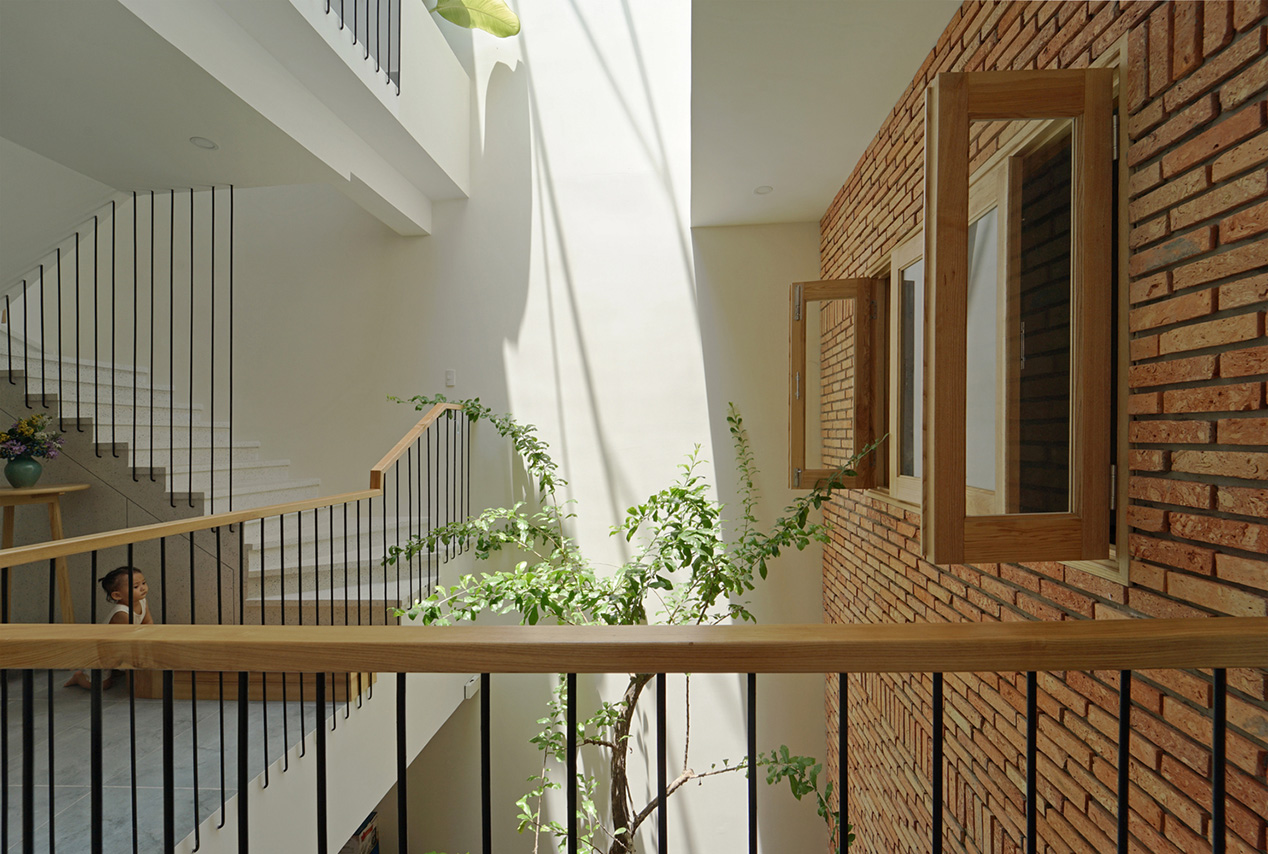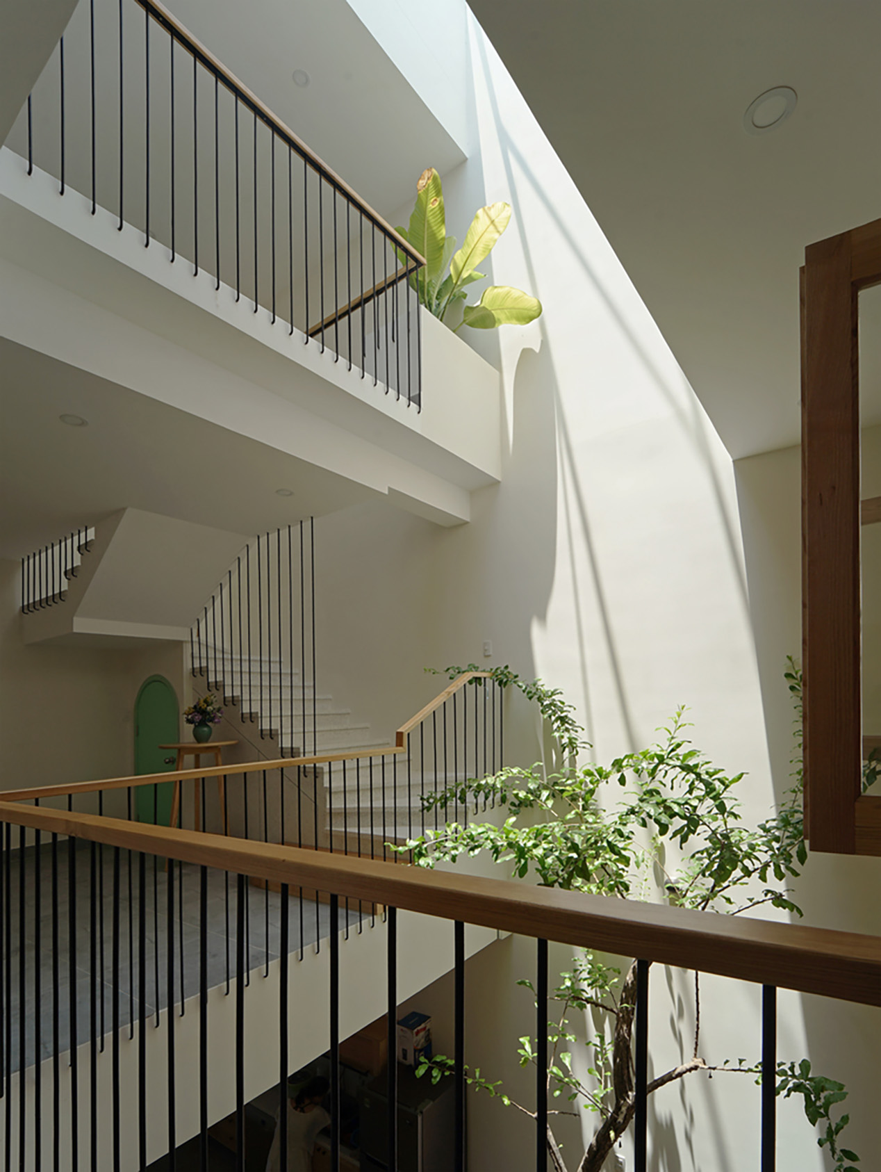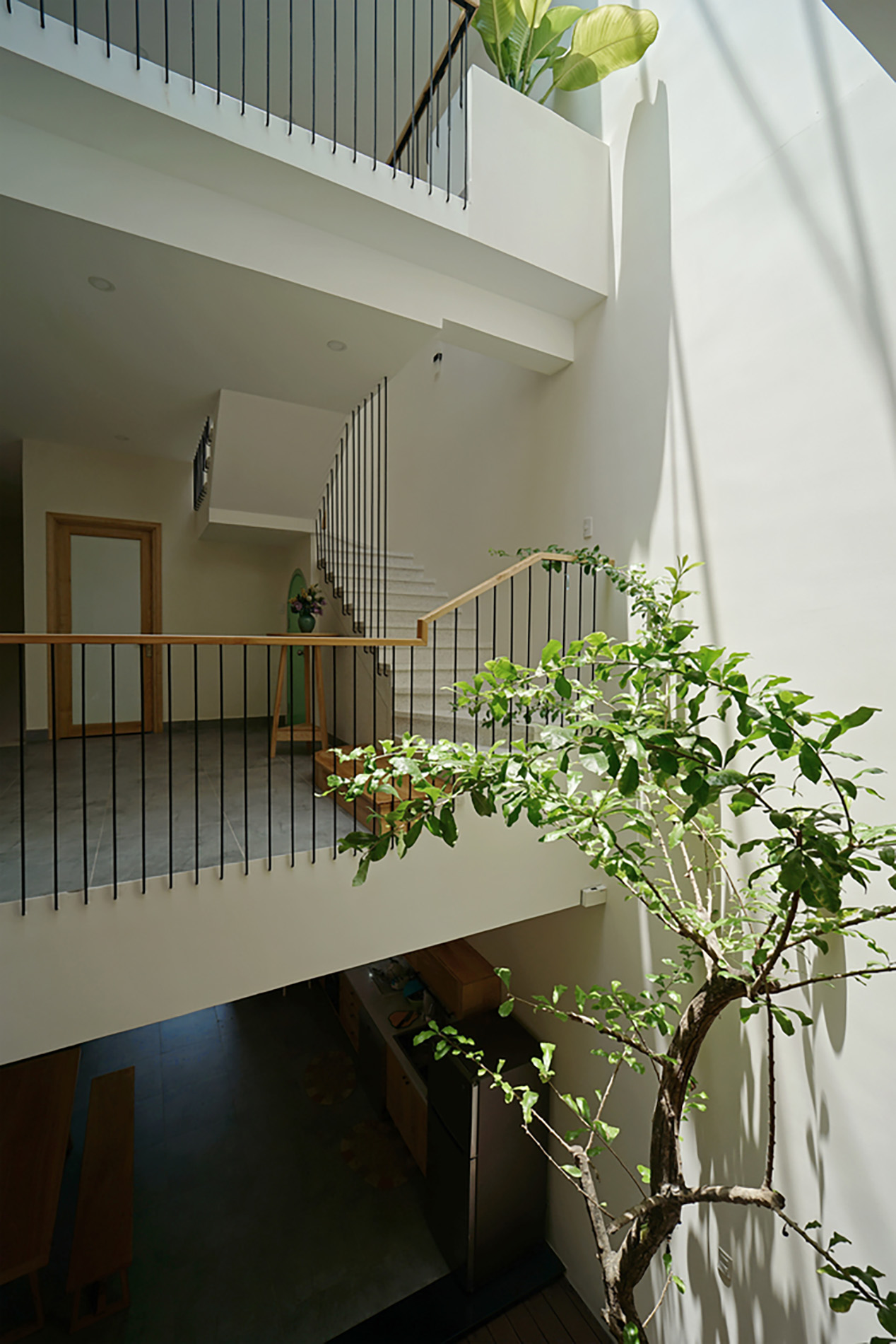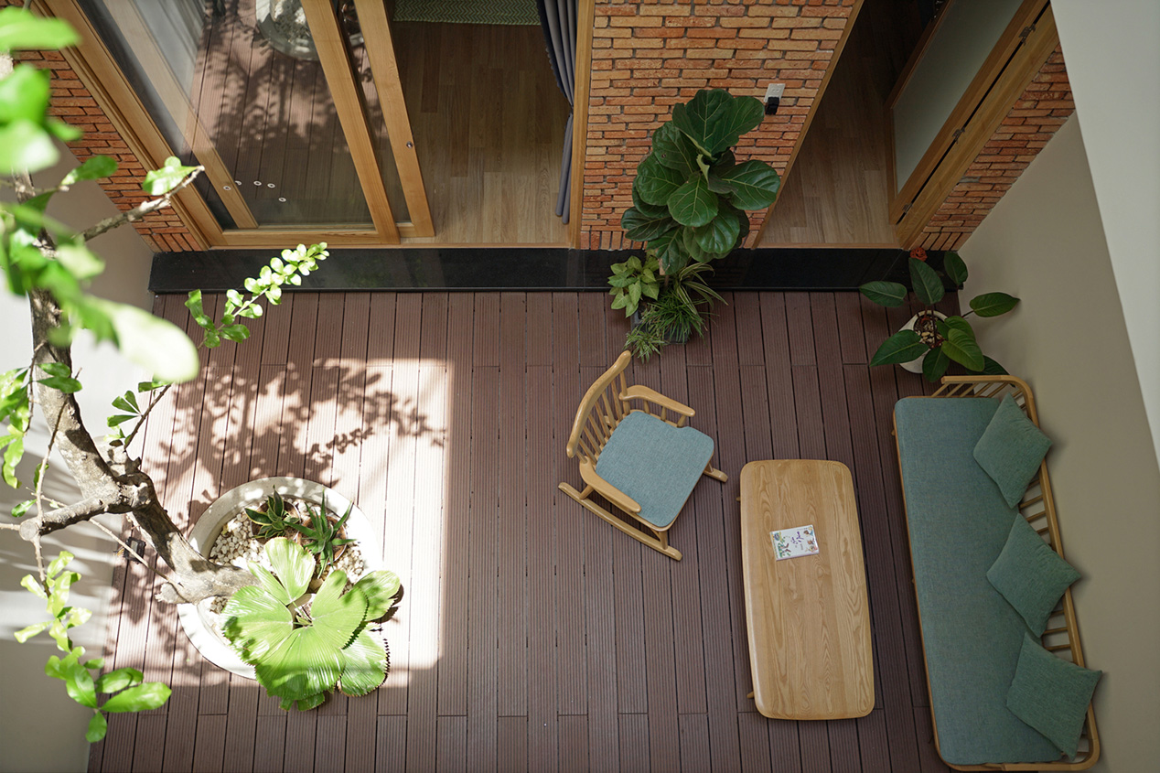 Trong thiết kế này, cây xanh không chỉ là trang trí – mà chính là “điểm kết nối”. Nhờ mảng xanh được bố trí xuyên tầng, các thành viên trong gia đình có thể nhìn thấy nhau, giao tiếp và tương tác dễ dàng hơn.
