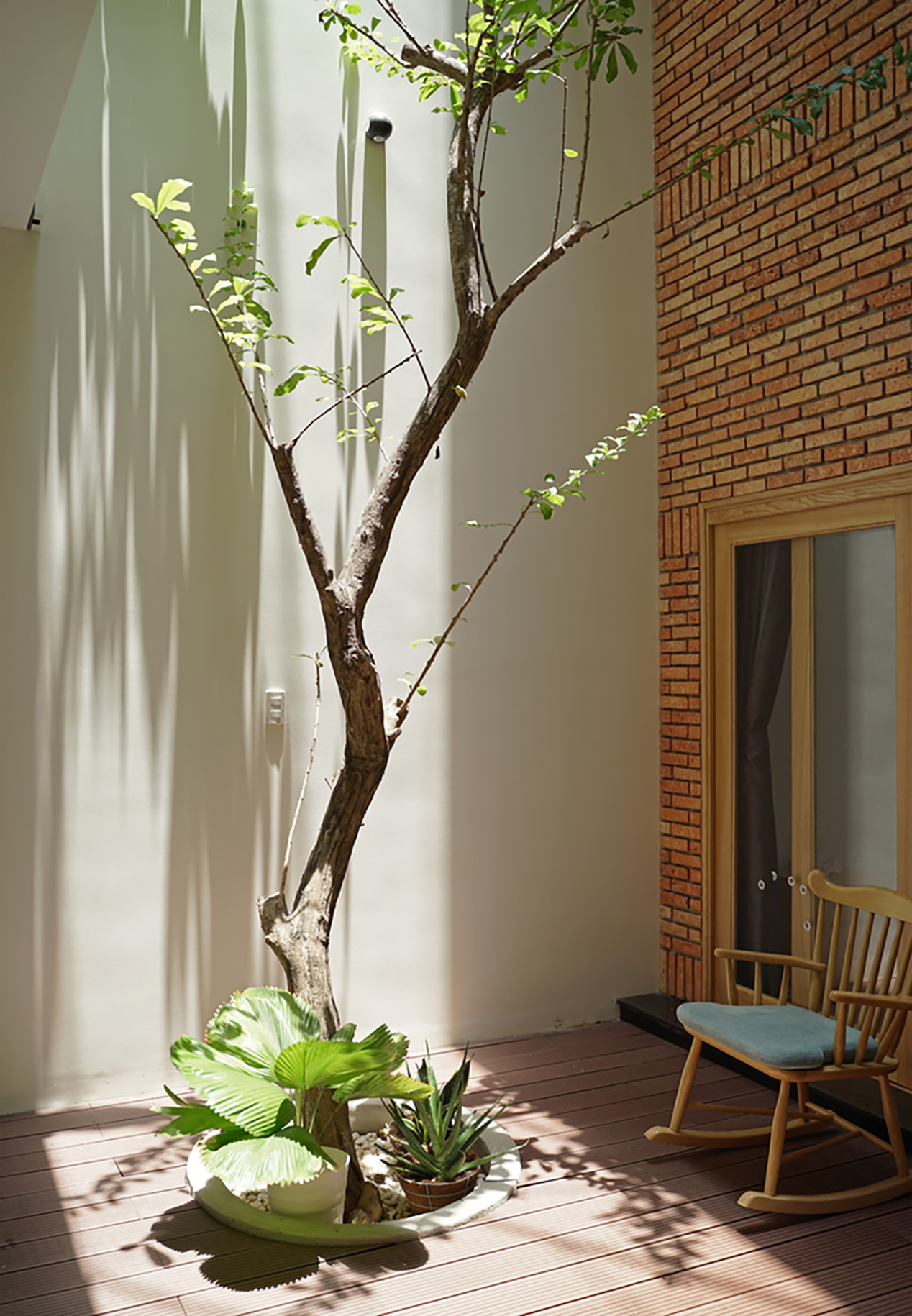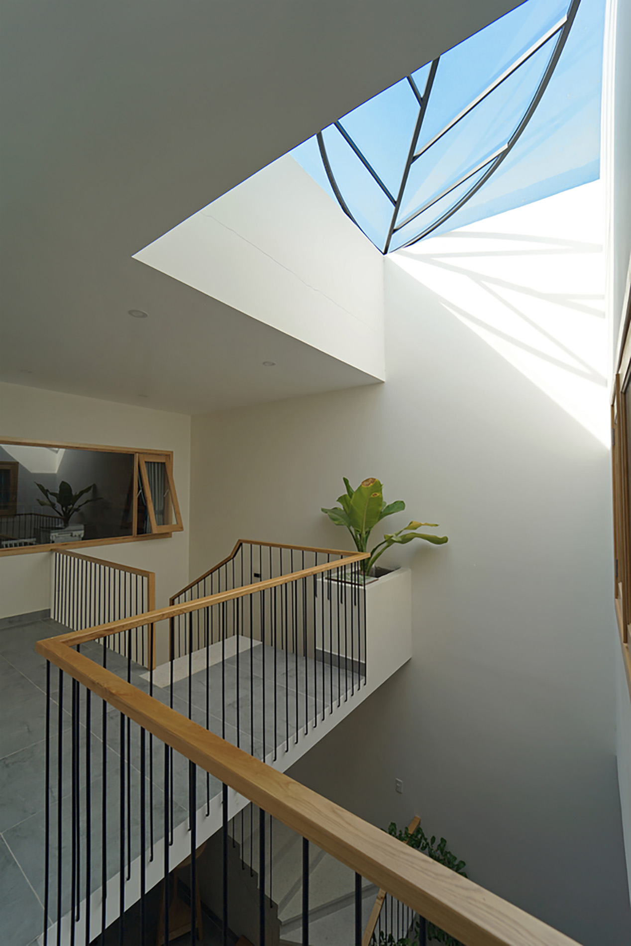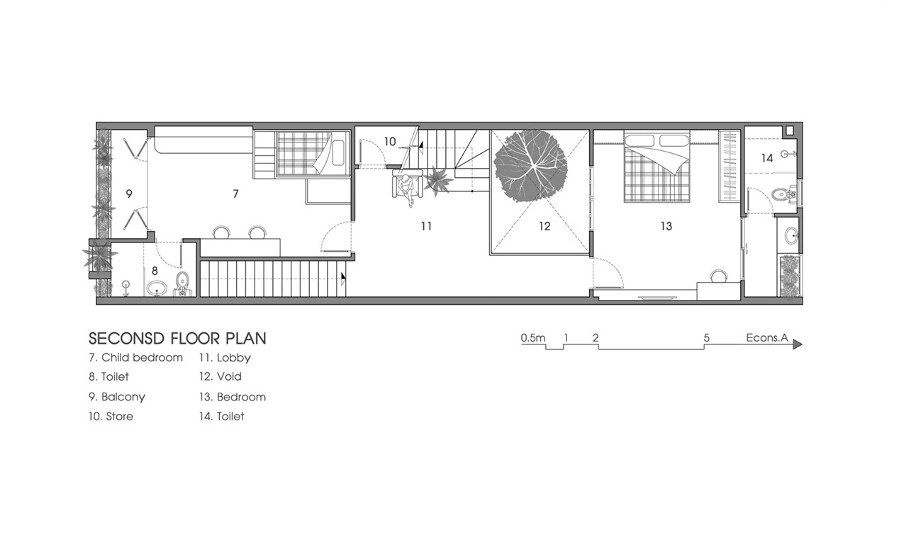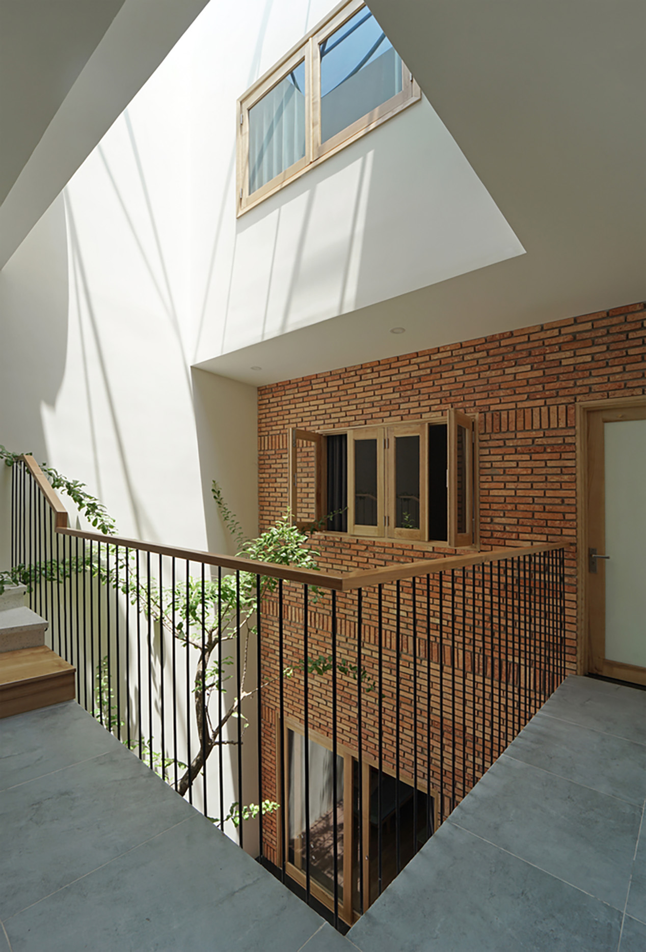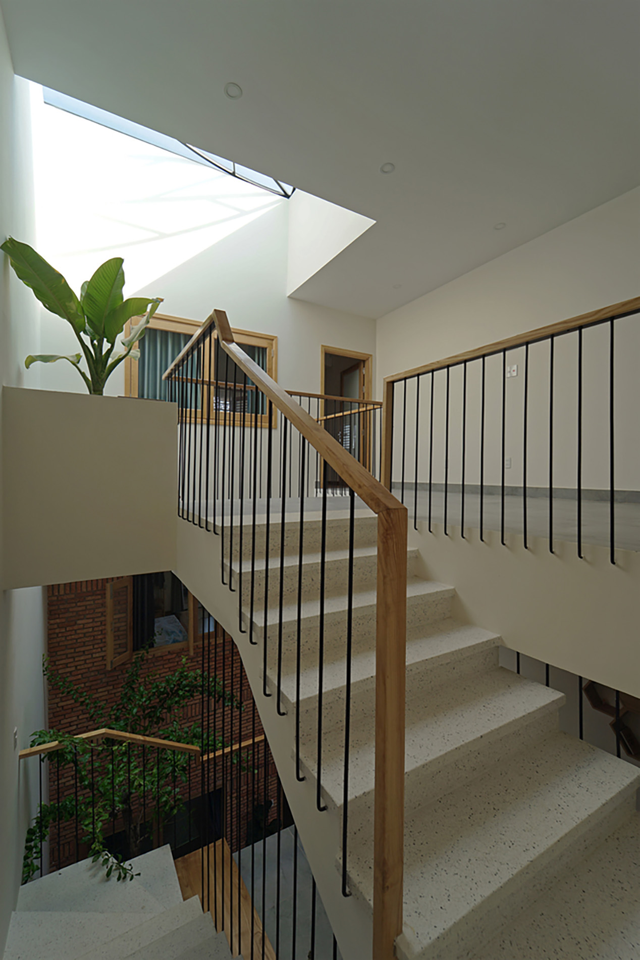 Trong thiết kế này, cây xanh không chỉ là trang trí – mà chính là “điểm kết nối”. Nhờ mảng xanh được bố trí xuyên tầng, các thành viên trong gia đình có thể nhìn thấy nhau, giao tiếp và tương tác dễ dàng hơn.
