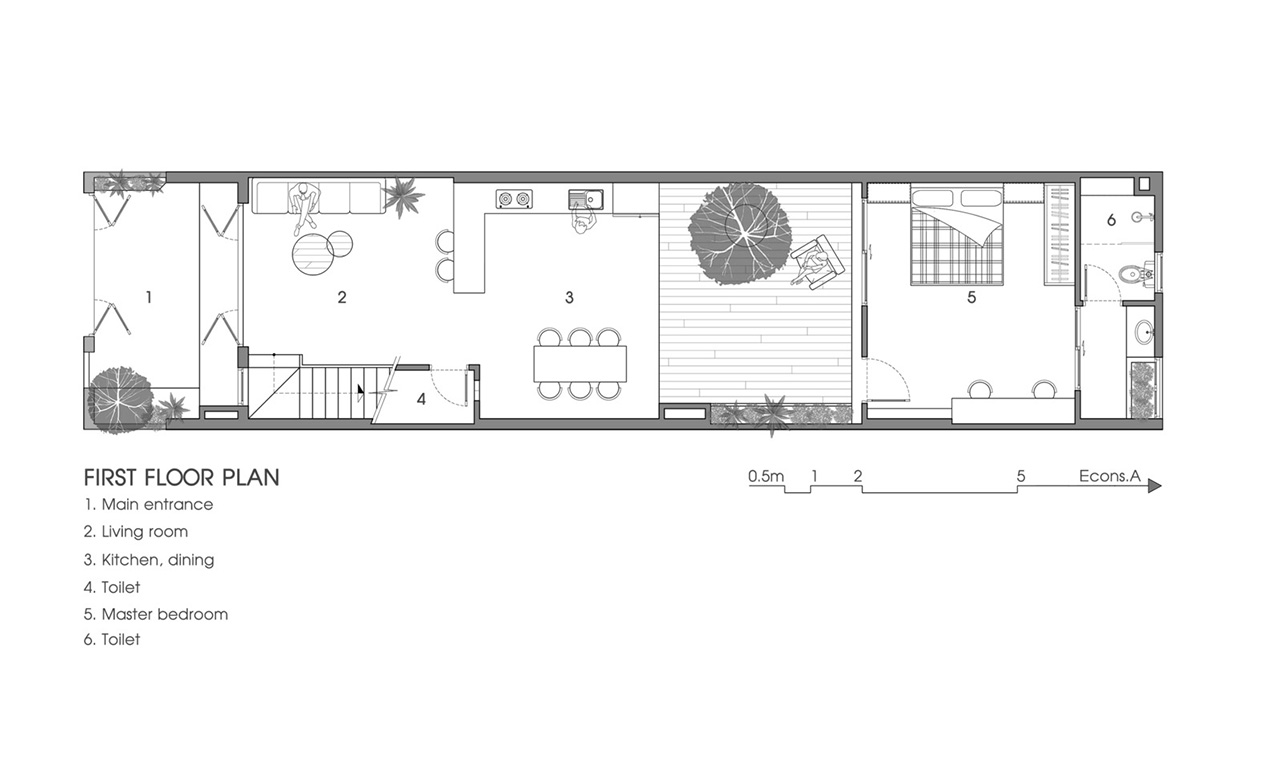 Trong hành trình tìm kiếm những không gian sống “đúng chất” Tổ Ấm Design luôn chọn lọc những công trình tham khảo tinh tế, mang giá trị về kiến trúc, cảm xúc và triết lý sống. Nhà phố Anne House Hòa Quý – một thiết kế nổi bật của Econs Architecture – là minh chứng rõ ràng cho cách con người có thể sống hài hòa cùng khí hậu địa phương, ánh sáng và thiên nhiên. Đây là mẫu nhà phố 5x20m phổ biến tại Việt Nam, được xử lý cực kỳ thông minh để vừa thoáng khí, vừa giảm bức xạ nhiệt, vừa duy trì nguồn năng lượng tự nhiên xuyên suốt ngôi nhà.