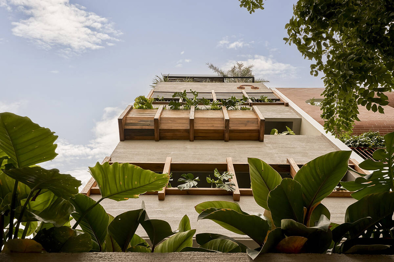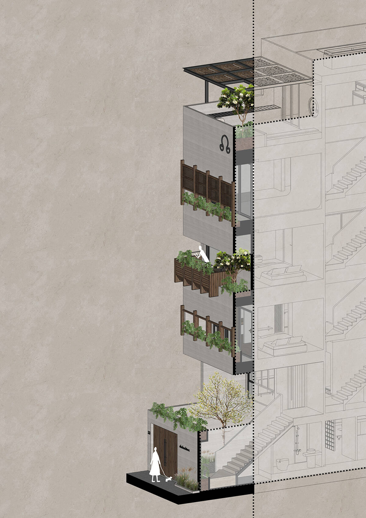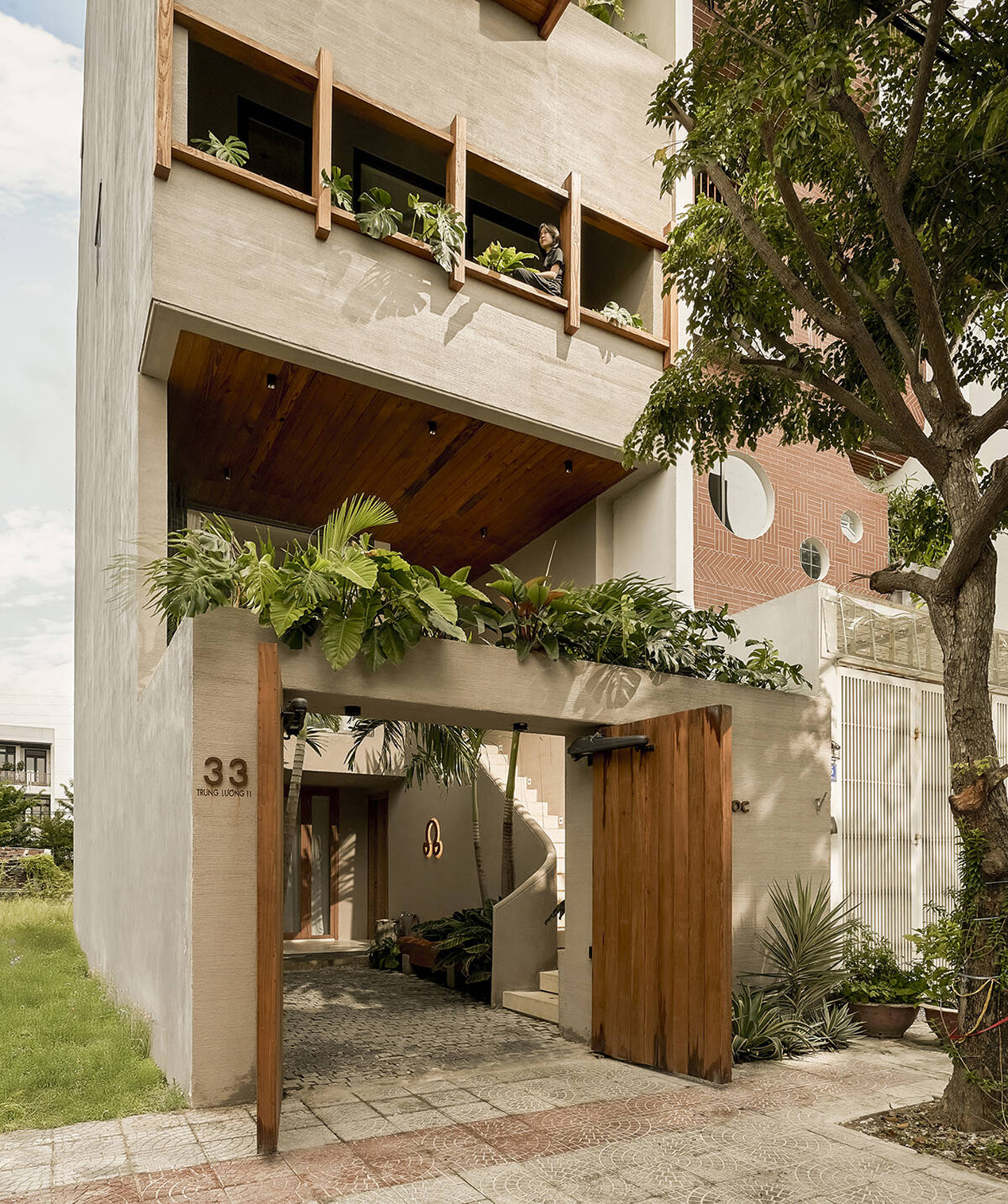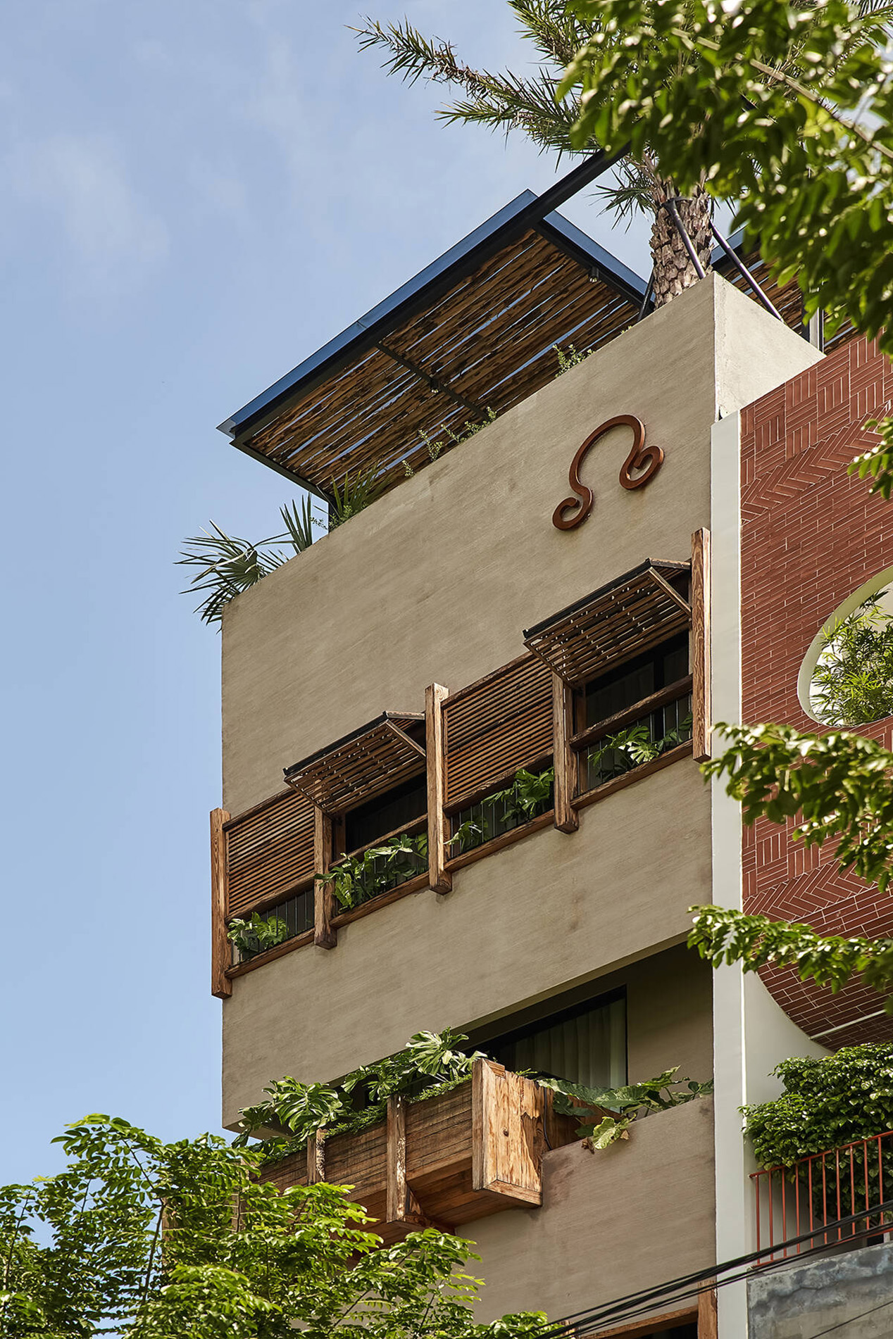 Lấy cảm hứng từ xúc tu bạch tuộc, mặt đứng là sự pha trộn có kiểm soát của các lớp vật liệu: gỗ biến tính, lam chớp, mảng xanh và hệ rỗng – đặc.