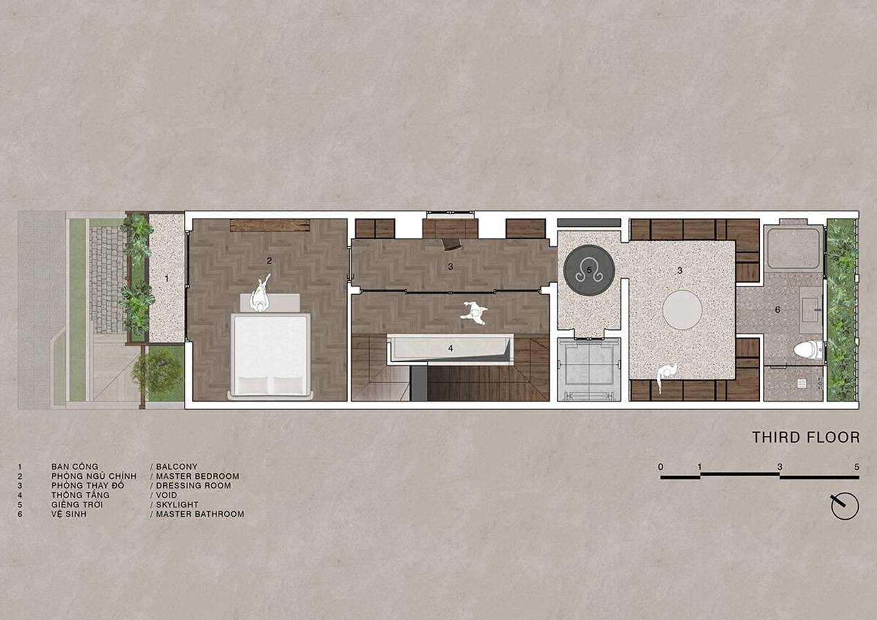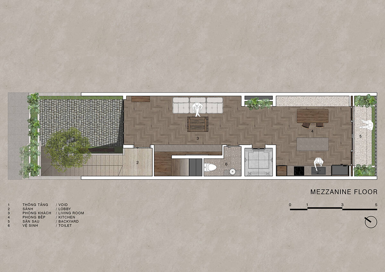 Tầng 1 là khu kinh doanh và sinh hoạt mini; tầng 2–3 là không gian ở; tầng 4 dành cho studio; tầng 5 là nơi thờ cúng và giặt phơi.