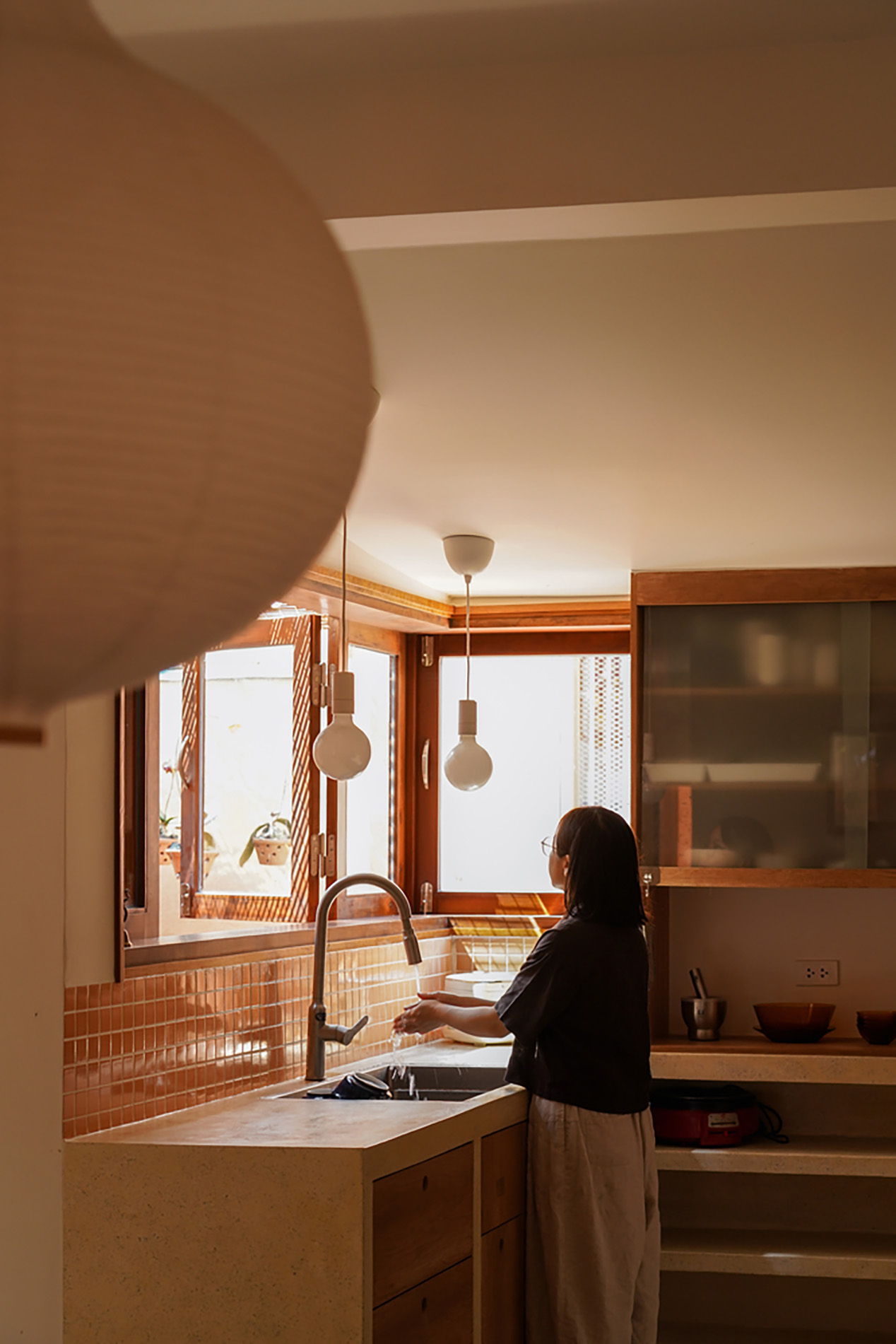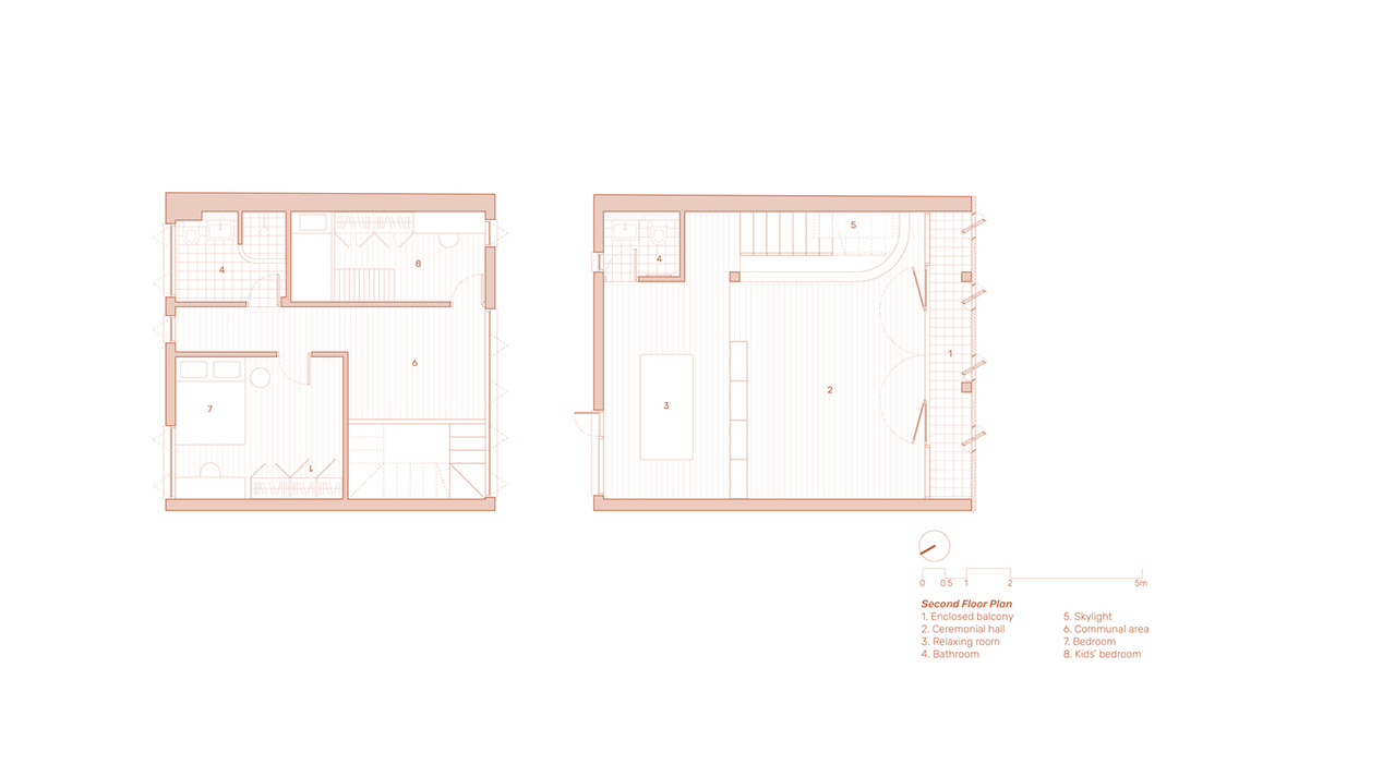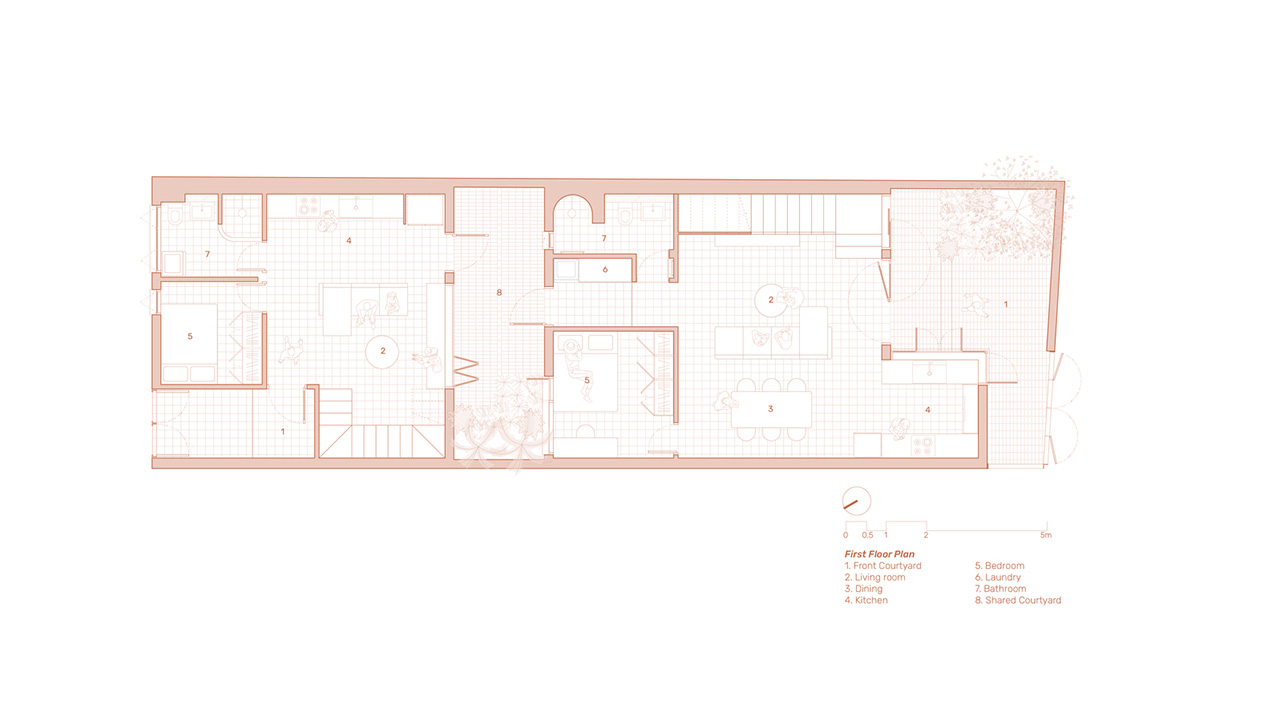 Công trình được thiết kế bởi live out studio, dành cho hai gia đình sống chung trên diện tích dài và hẹp 7×22 mét. Với tư duy tổ chức không gian thông minh, Terracotta Breath House tạo ra sự kết nối nhẹ nhàng giữa bố mẹ và con gái, đồng thời vẫn đảm bảo sự riêng tư cần thiết của hai thế hệ.