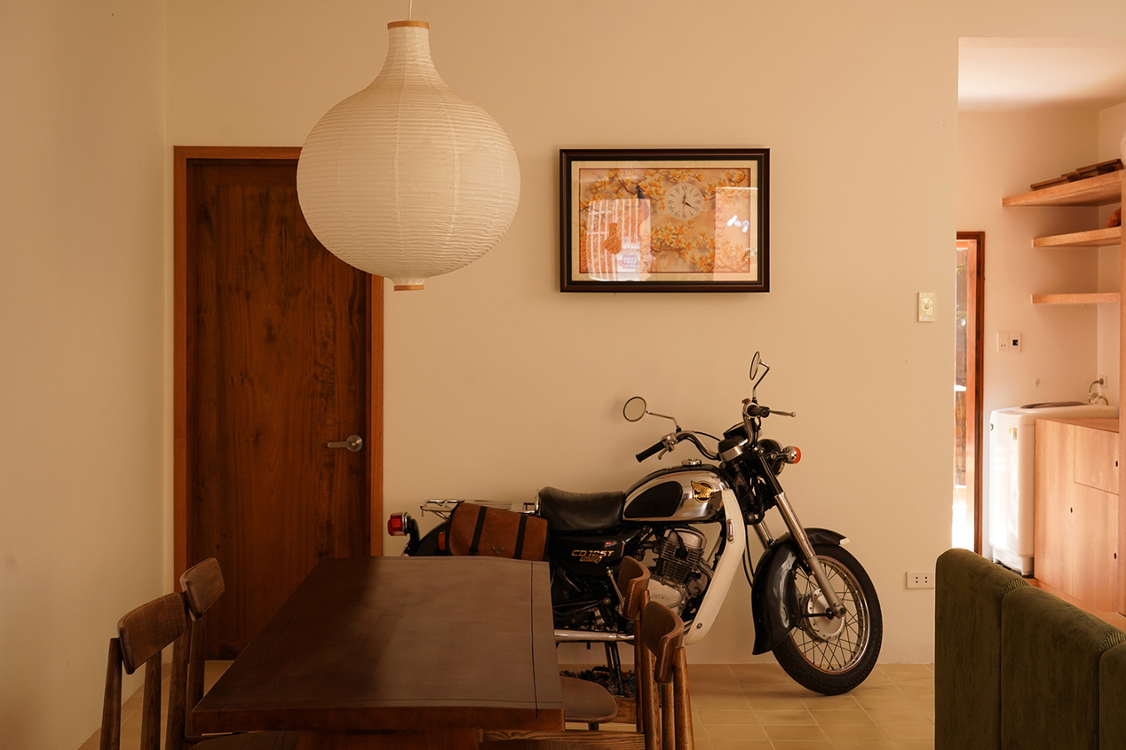 Nhà của bố mẹ được thiết kế mang hơi hướng truyền thống: phòng khách – bếp mở ra sân, cầu thang uyển chuyển, phòng thờ trang nghiêm và góc đọc sách tràn ánh sáng. Vật liệu mộc mạc mang lại cảm giác an yên và ấm cúng.