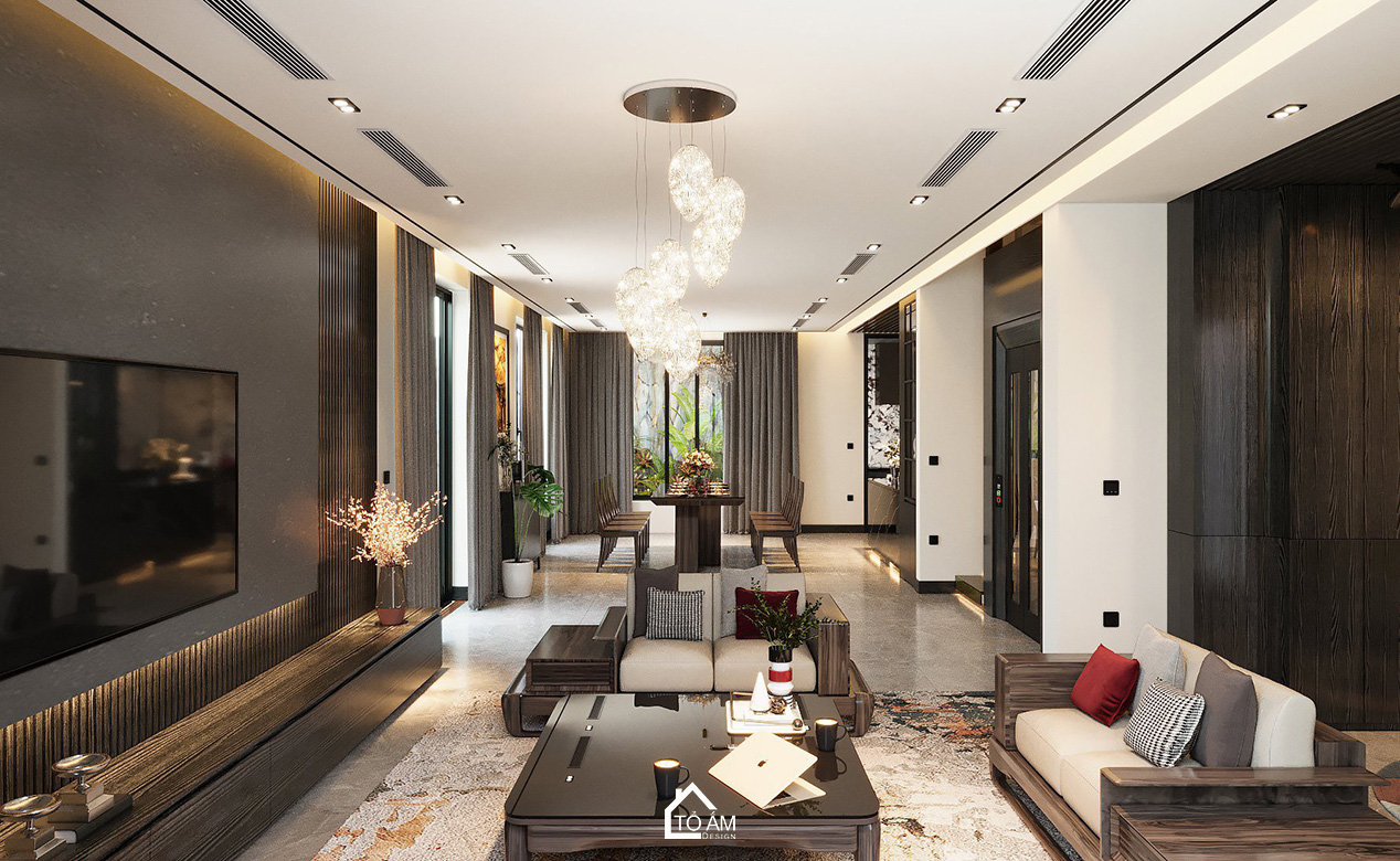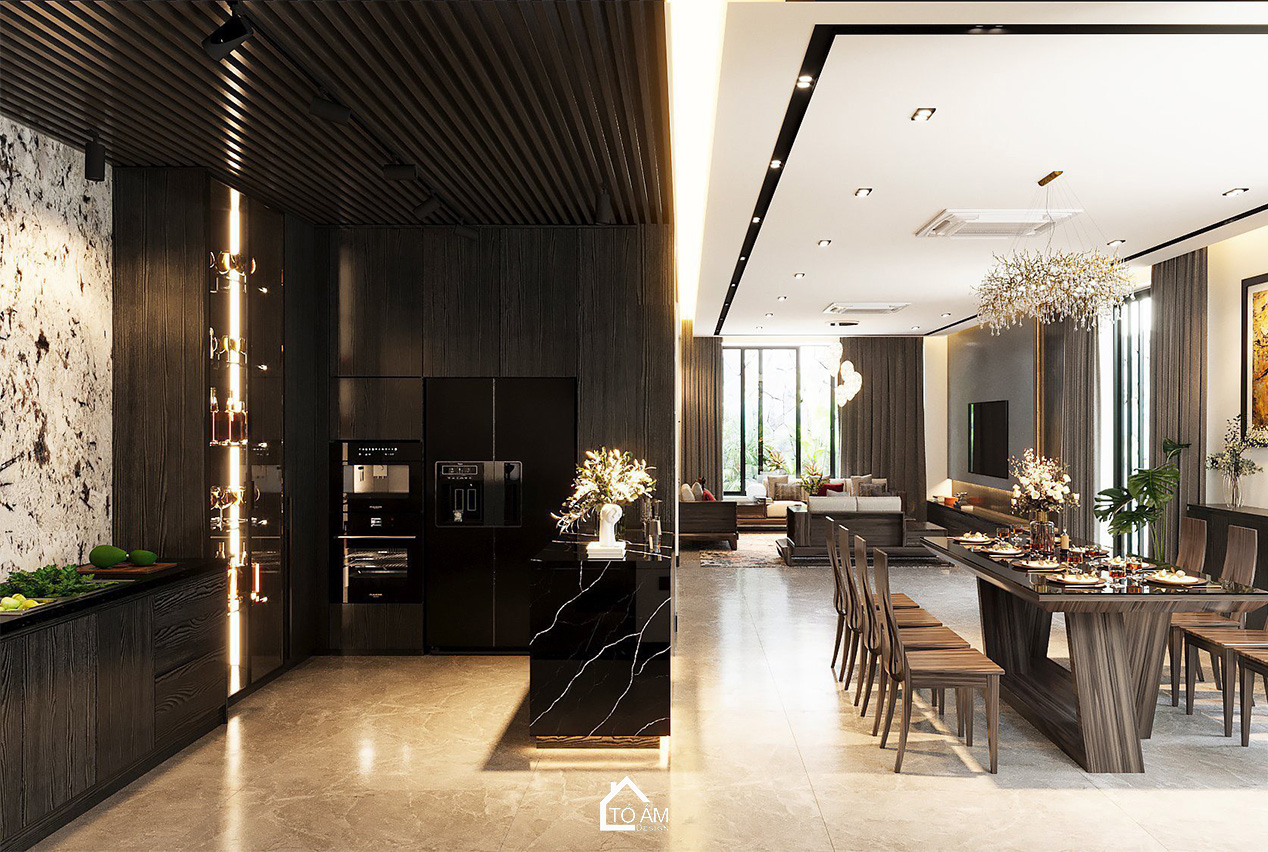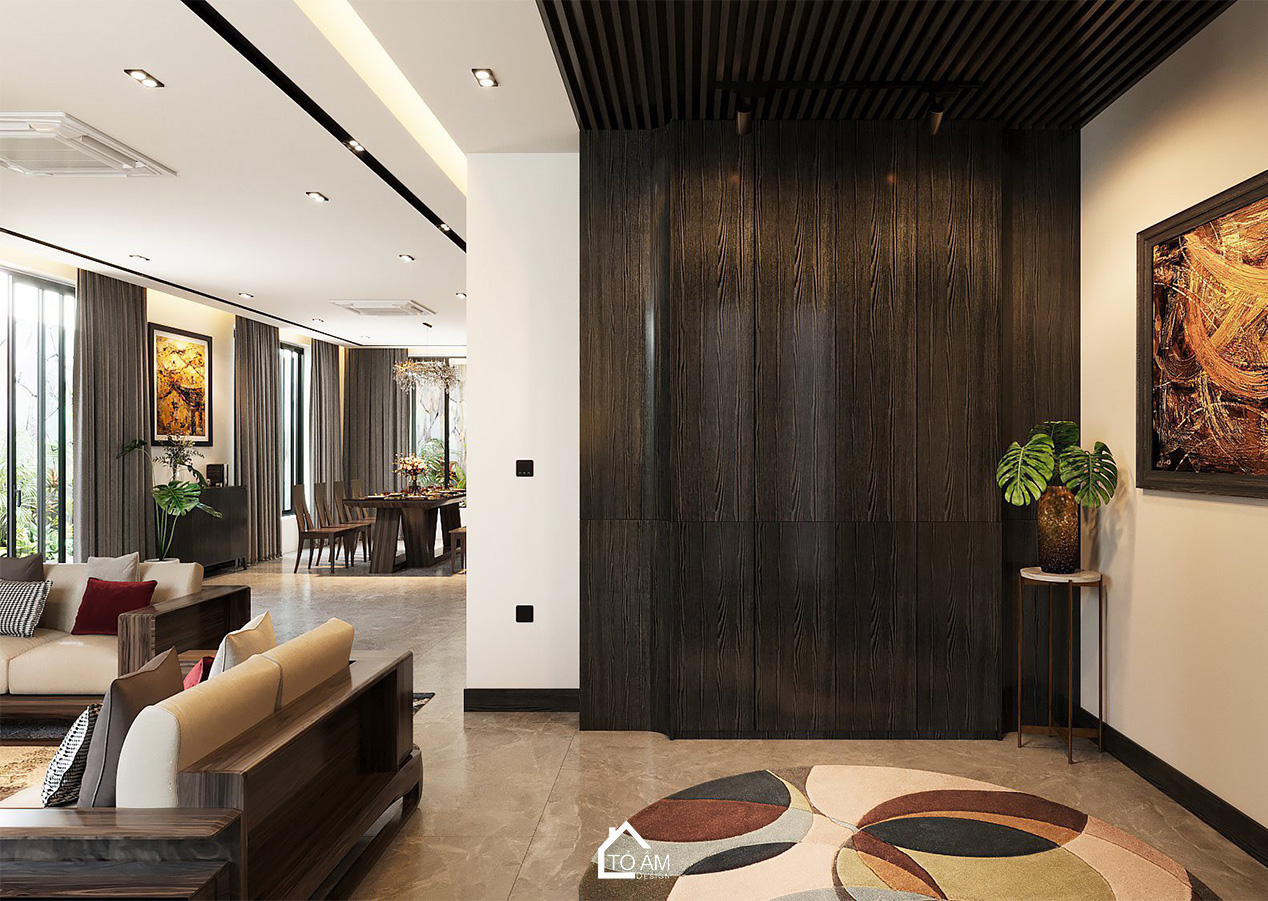 Phòng khách mở ra với gam màu đen xám tương phản, tạo chiều sâu và sự huyền bí. Nội thất gỗ Sồi Mỹ tự nhiên kết hợp với gỗ Óc Chó mang đến sự sang trọng, mộc mạc, đồng thời hòa quyện với thiên nhiên bên ngoài. Ánh sáng tự nhiên từ cửa kính lớn giúp căn phòng luôn tràn đầy sức sống, là nơi thư giãn lý tưởng sau những giờ làm việc.