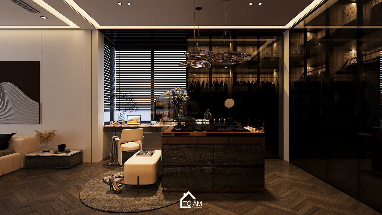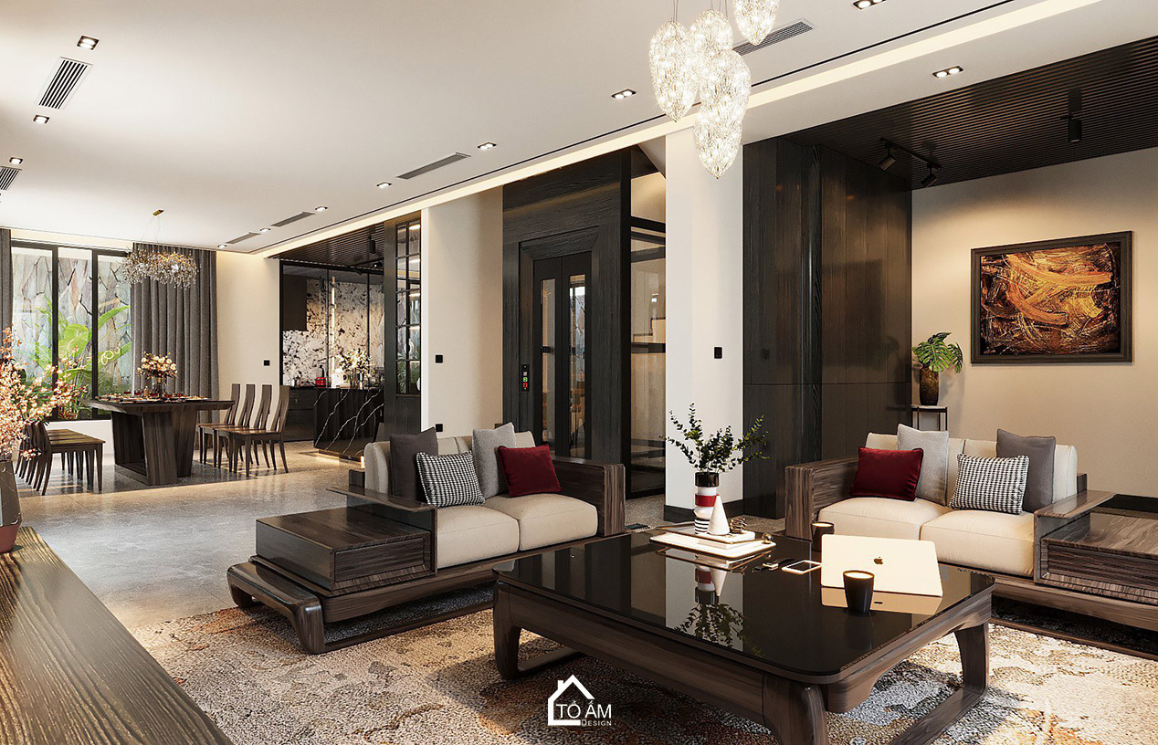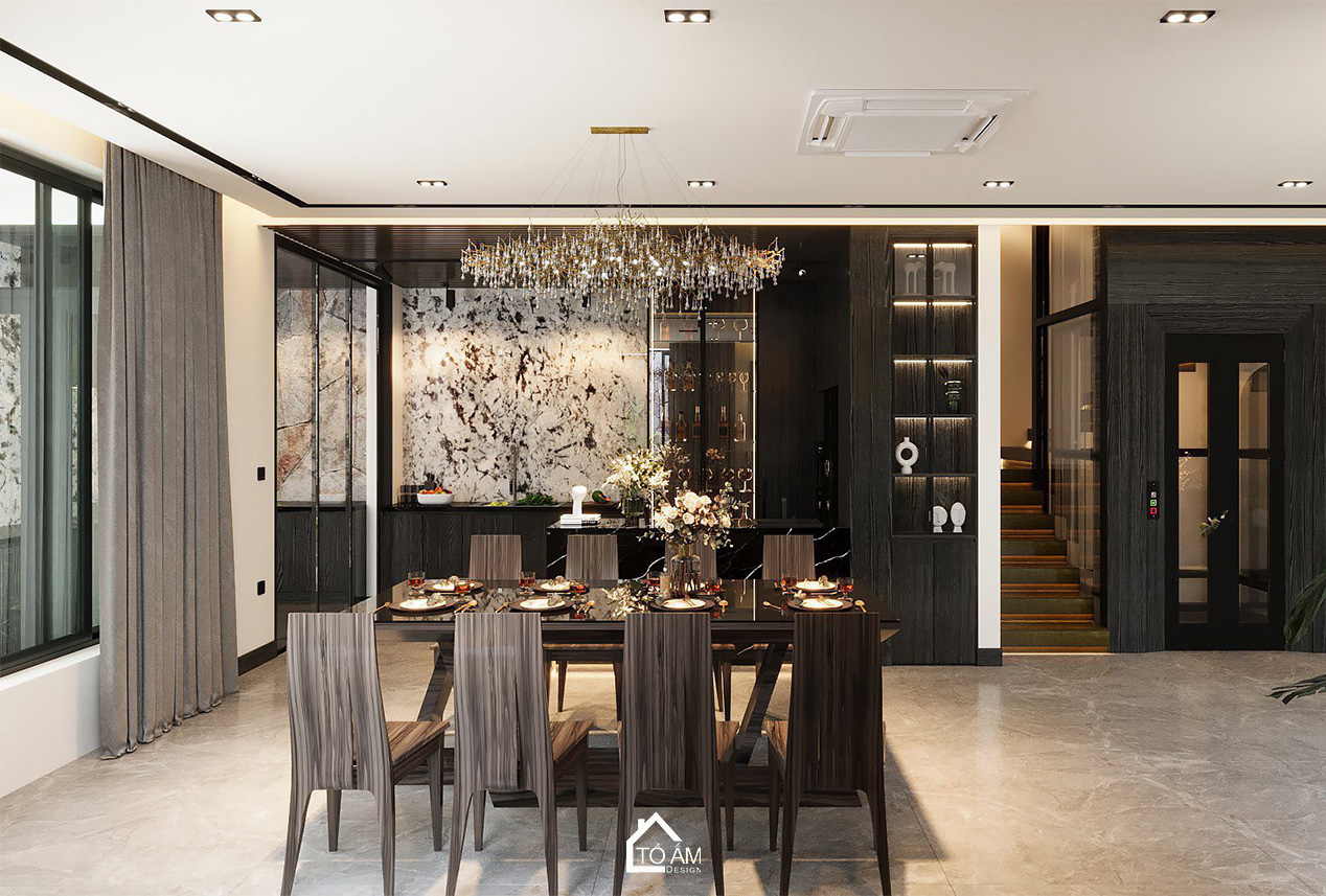 Phòng khách mở ra với gam màu đen xám tương phản, tạo chiều sâu và sự huyền bí. Nội thất gỗ Sồi Mỹ tự nhiên kết hợp với gỗ Óc Chó mang đến sự sang trọng, mộc mạc, đồng thời hòa quyện với thiên nhiên bên ngoài. Ánh sáng tự nhiên từ cửa kính lớn giúp căn phòng luôn tràn đầy sức sống, là nơi thư giãn lý tưởng sau những giờ làm việc.