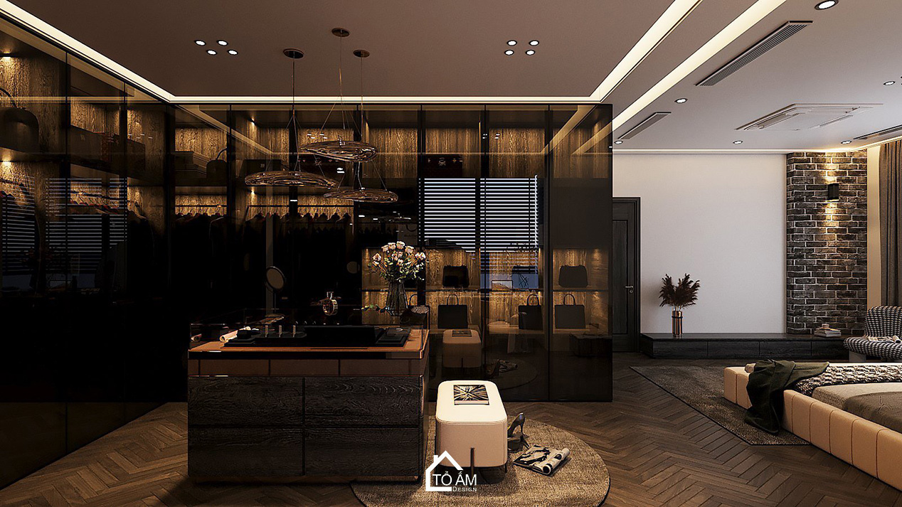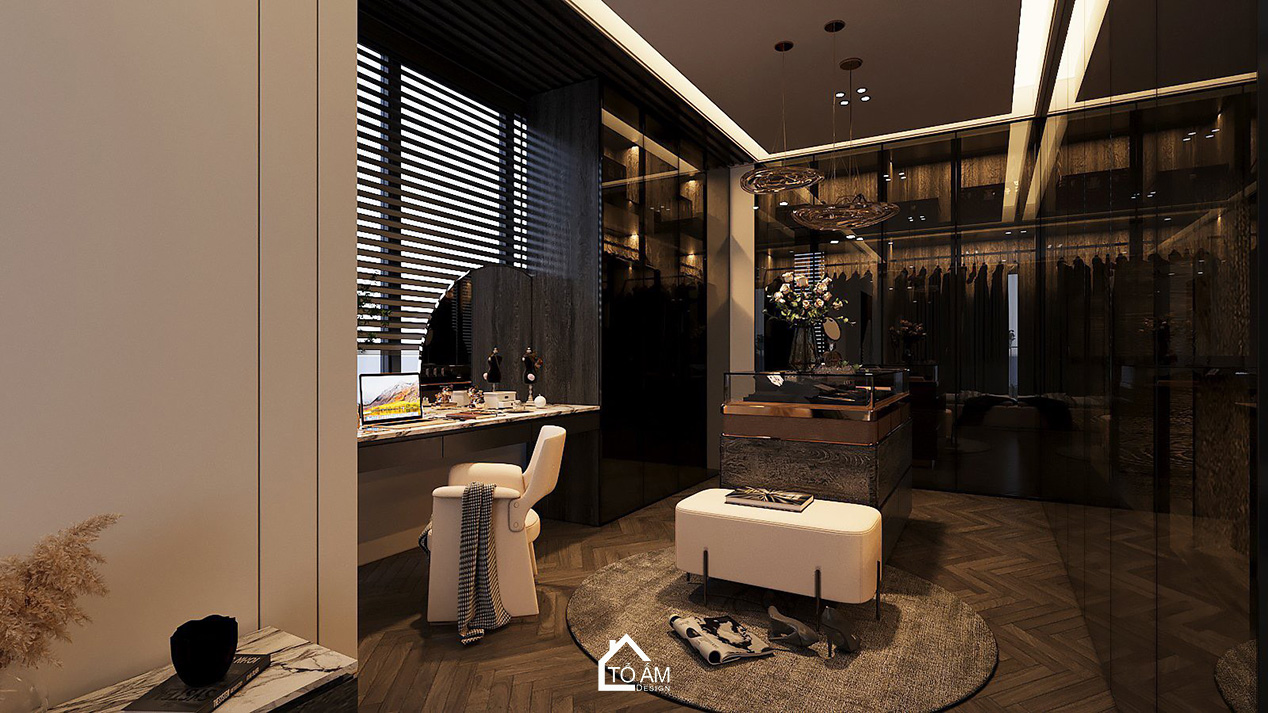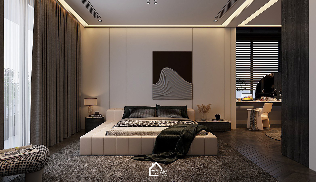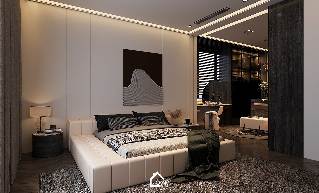 Phòng ngủ master biệt thự 3 tầng Ocean Park, phong cách hiện đại, gam màu tương phản sang trọng.Phòng thờ được bố trí trang nghiêm, sử dụng gỗ tự nhiên kết hợp màu sắc hiện đại – tối giản. Không gian vừa tôn trọng giá trị truyền thống, vừa đồng điệu với tổng thể ngôi nhà, là nơi kết nối tinh thần, mang lại sự bình an cho gia đình.
