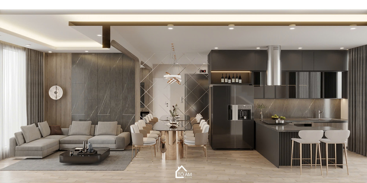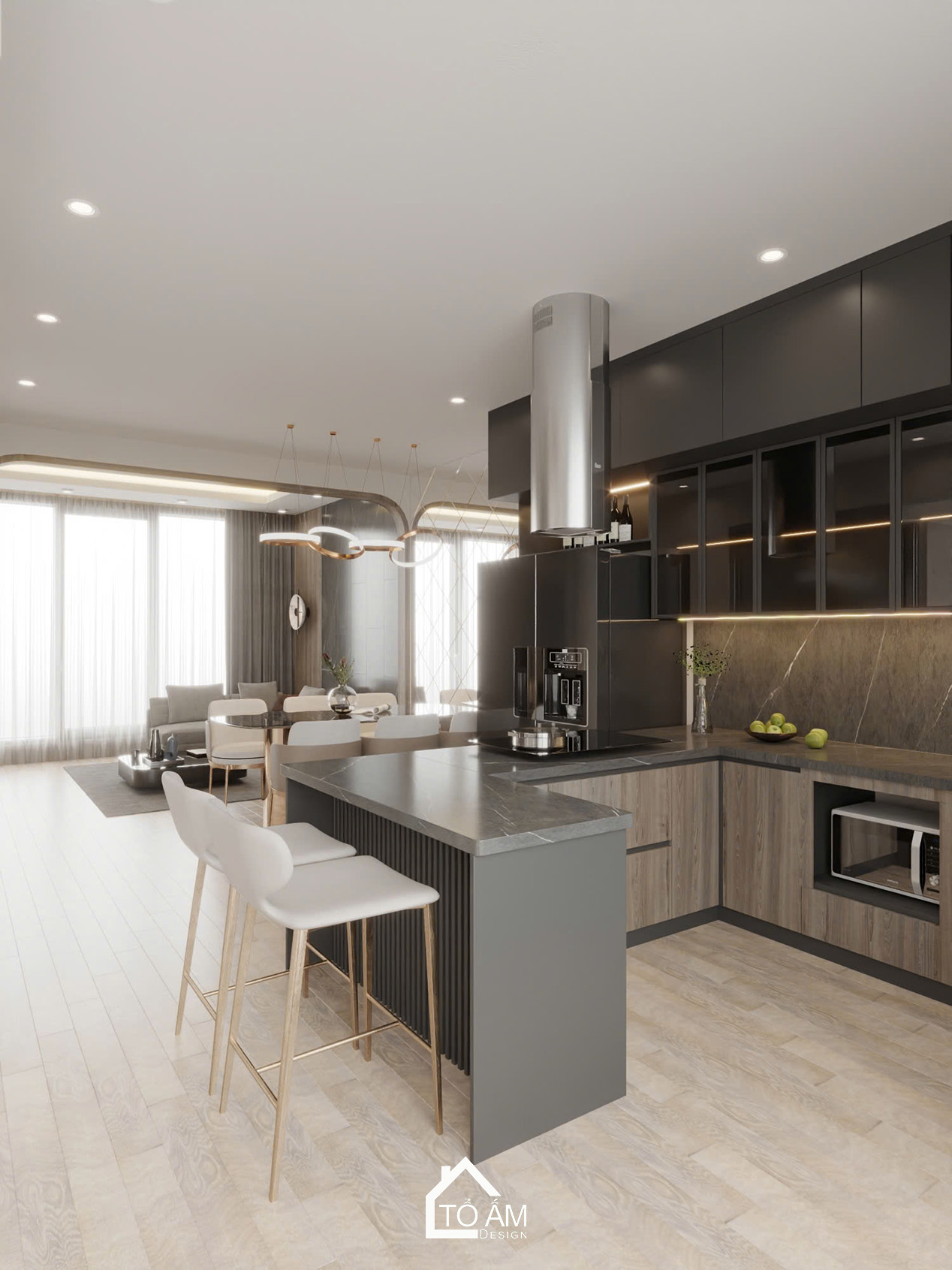 Bếp là nơi kết nối các thành viên gia đình. Thiết kế mở, tối giản với chất liệu gỗ MDF chống ẩm tạo cảm giác sạch sẽ, tiện dụng nhưng vẫn giữ được vẻ ấm cúng. Bàn bếp tối màu kết hợp hệ thống tủ gọn gàng giúp căn bếp trở thành không gian yêu thích để nấu nướng và chia sẻ những khoảnh khắc bên gia đình.