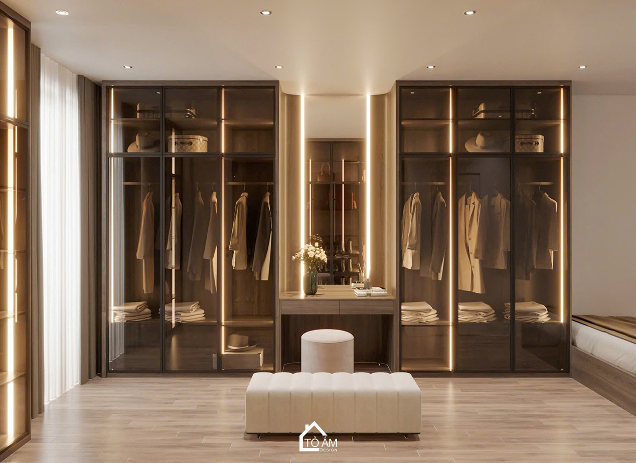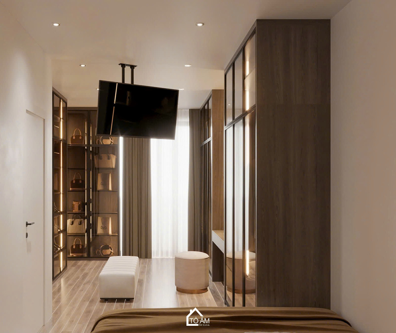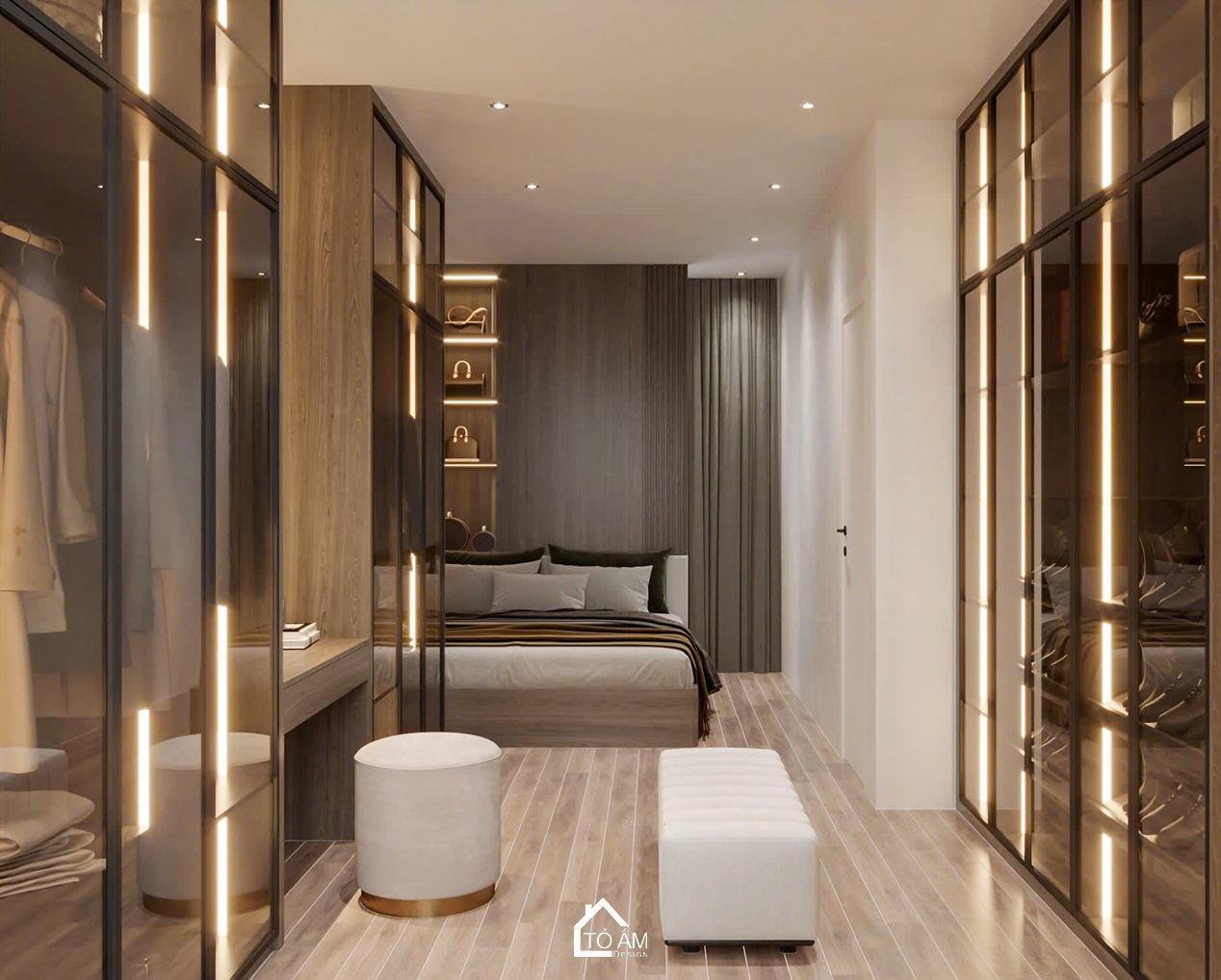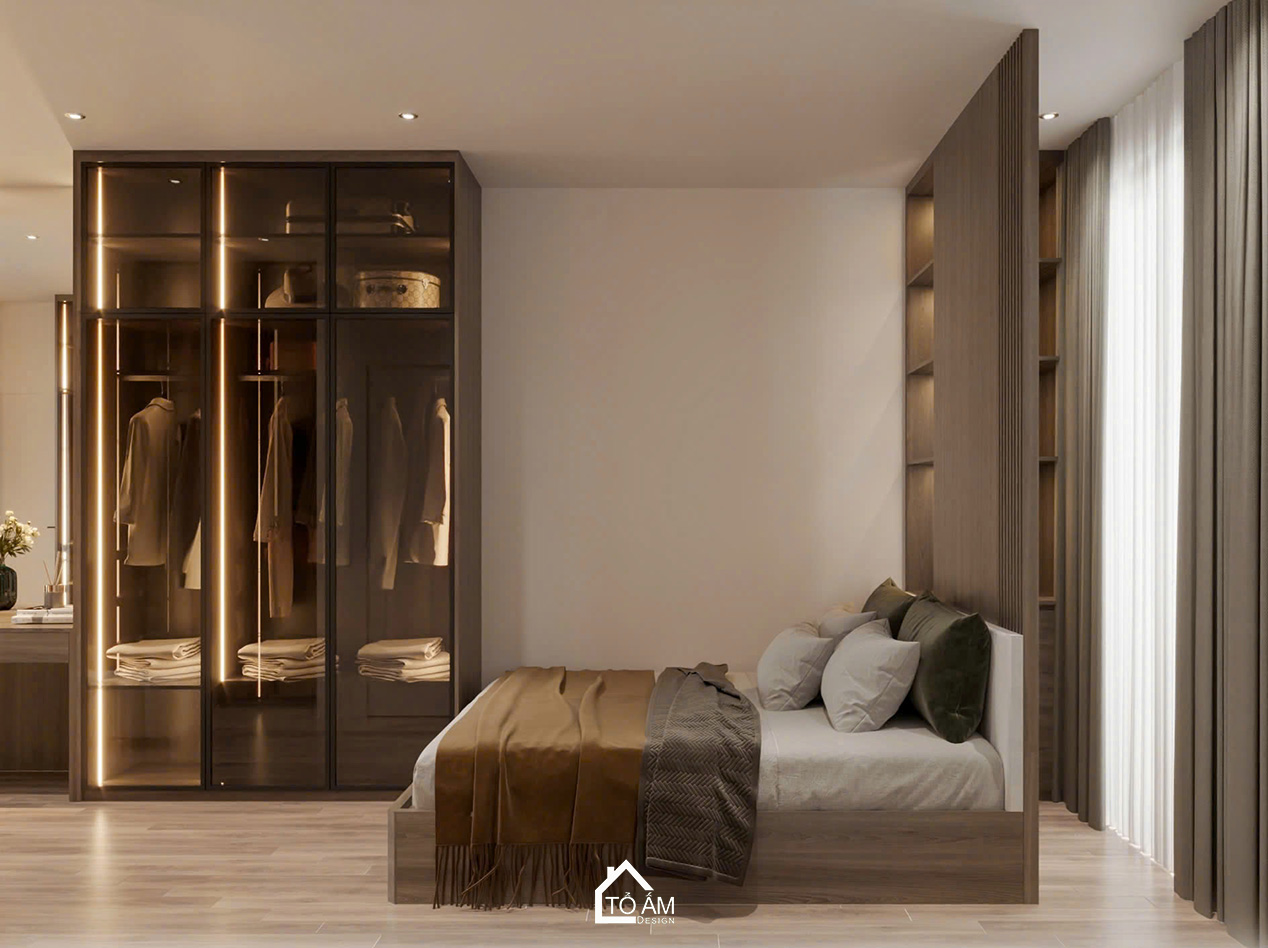 Phòng ngủ master là nơi chủ nhân tận hưởng sự thư giãn tuyệt đối. Gam màu tối kết hợp ánh sáng gián tiếp tạo chiều sâu và không gian yên bình. Giường lớn, tủ âm tường và kệ trang trí tối giản đem lại sự tinh tế và tiện nghi. Mỗi chi tiết trong phòng đều hướng tới trải nghiệm “chữa lành cảm xúc”, giúp bạn bắt đầu và kết thúc ngày mới trong sự thư thái.