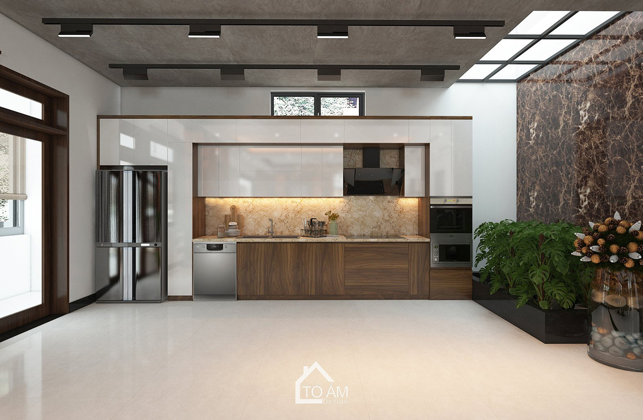 Hình ảnh 3D phòng khách penhouse Hòa Lạc với nội thất gỗ Óc ChóPhòng bếp của thiết kế 3D penthouse Hòa Lạc sử dụng gỗ Óc Chó nhập khẩu cho toàn bộ tủ bếp, đảo bếp và bàn ăn, kết hợp phụ kiện Hafele Đức, tạo nên một không gian vừa hiện đại, vừa ấm áp. Tông màu trầm kết hợp ánh sáng vàng nhẹ giúp mỗi bữa ăn trở nên thân mật, ấm cúng. Ban công bên cạnh bếp với cây cảnh và vườn lan tạo sự kết nối với thiên nhiên, giúp gia chủ cảm nhận sự thư thái, dễ chịu sau những giờ làm việc căng thẳng.