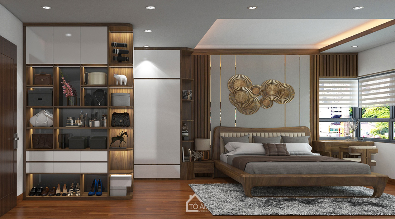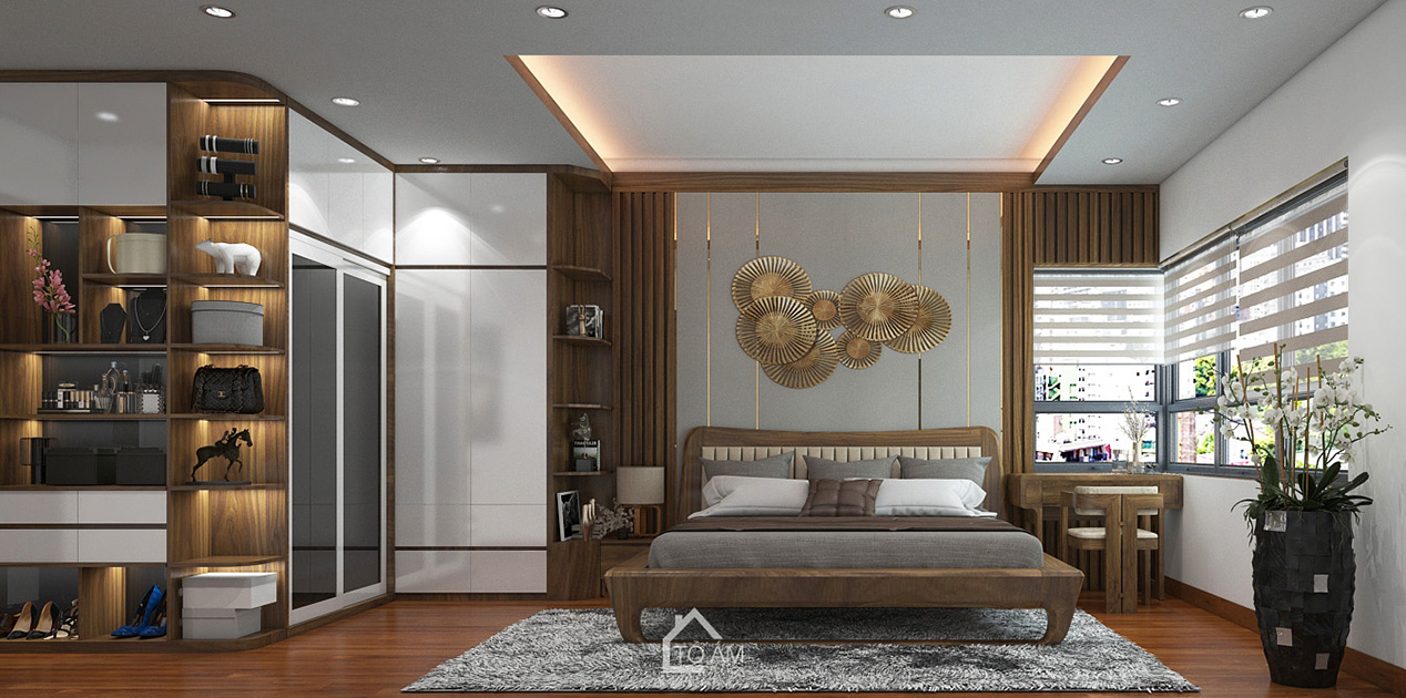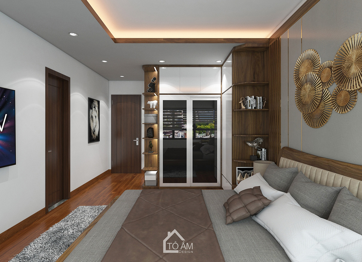Hình ảnh 3D phòng ngủ master sang trọng với gỗ Óc ChóCăn penthouse Hòa Lạc không chỉ là nơi nghỉ ngơi, mà còn là biểu tượng đẳng cấp và gu thẩm mỹ của chủ nhà, nơi Tổ Ấm Design biến từng chi tiết gỗ Óc Chó, từng vật liệu cao cấp thành không gian sống tràn đầy cảm xúc. Đây là minh chứng cho tôn chỉ hoạt động của chúng tôi: Kiến tạo không gian, chữa lành cảm xúc.